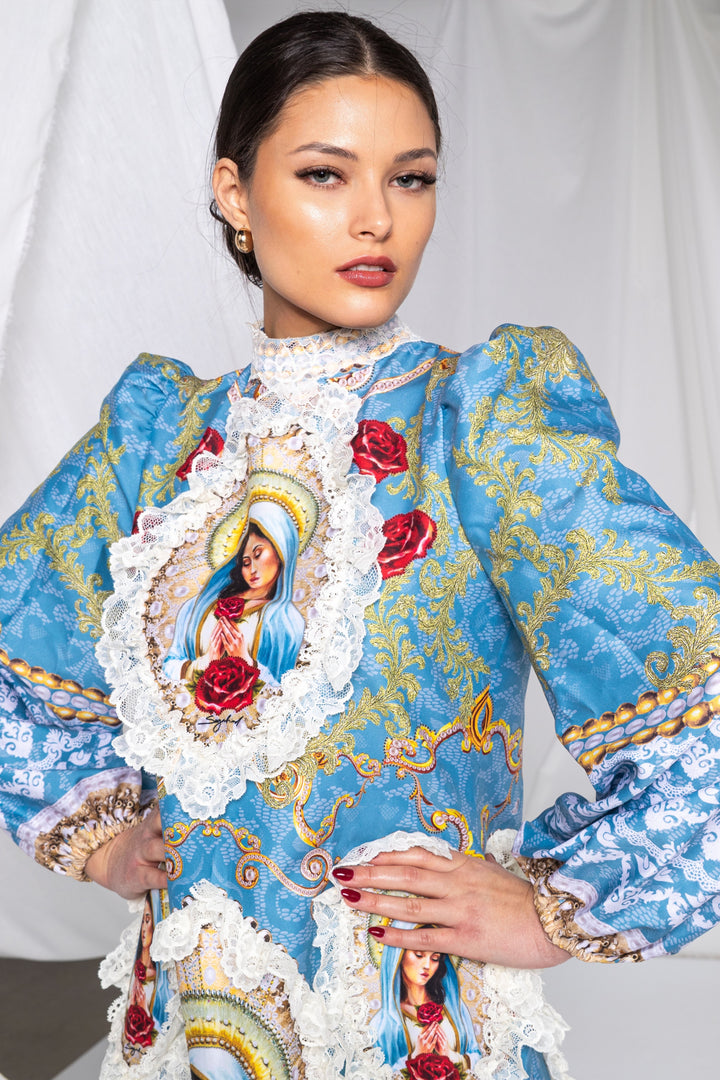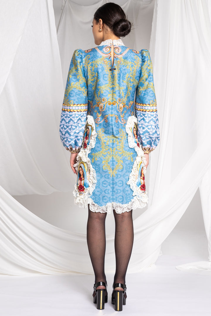 Above-the-knee length dress with long, puffed sleeves and a loose fit. The neck is framed by a wide tailored strap that closes with buttons over a slit at the back. The neck, bottom and portrait graphics are decorated with lace frills all around. On the back