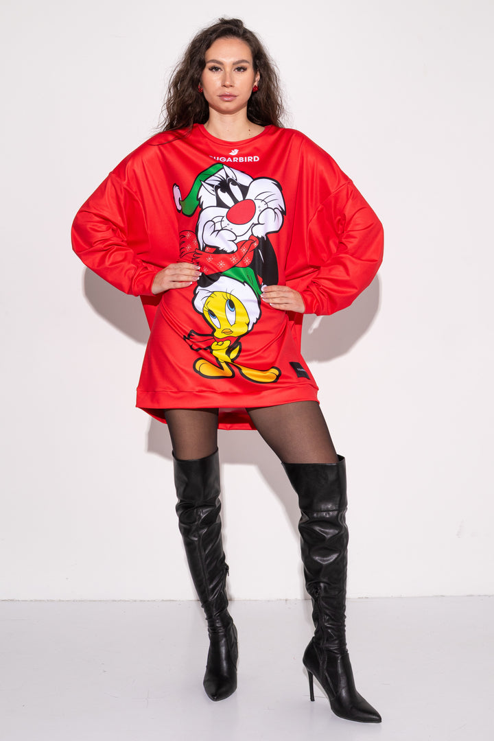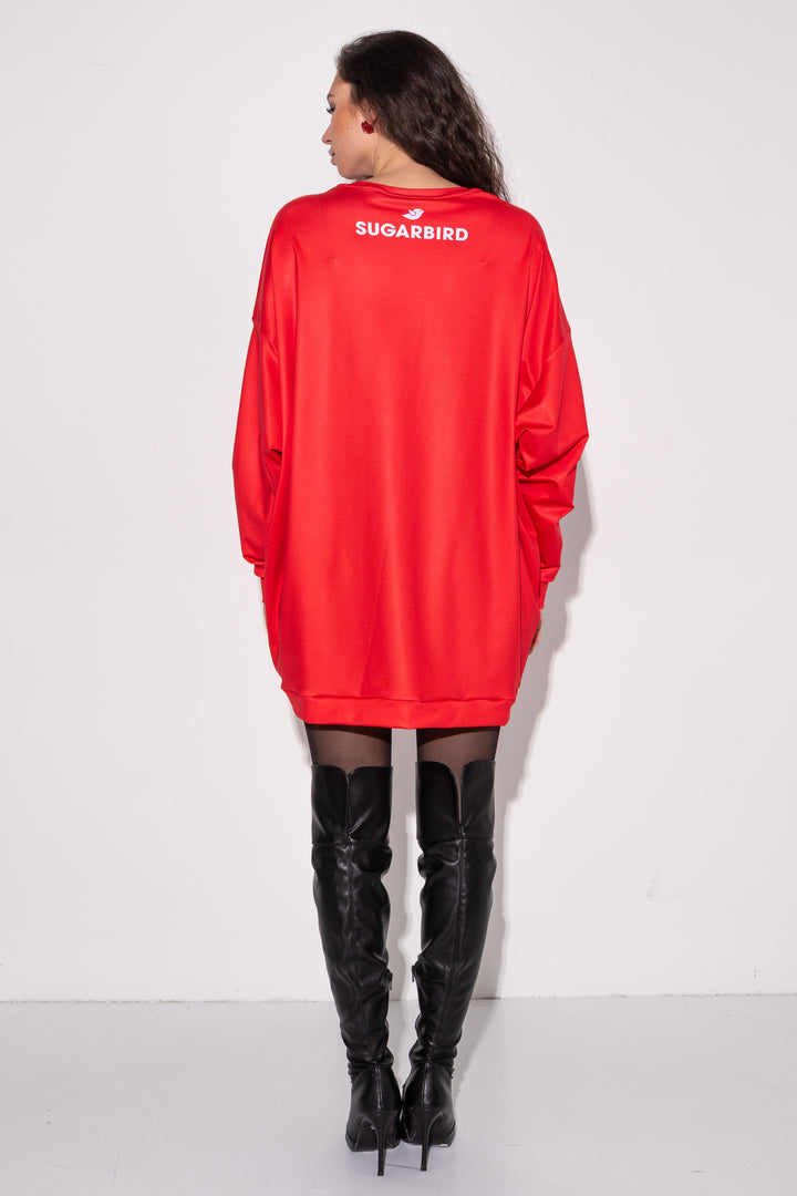 Hosszú ujjú, combközép hosszúságú, bő, oversize fazonú pulóver. Zárt kerek nyakát, alját és ujja alját félbehajtott pántok szegik. Elejére SUGARBIRD feliratú címkét varrtunk.