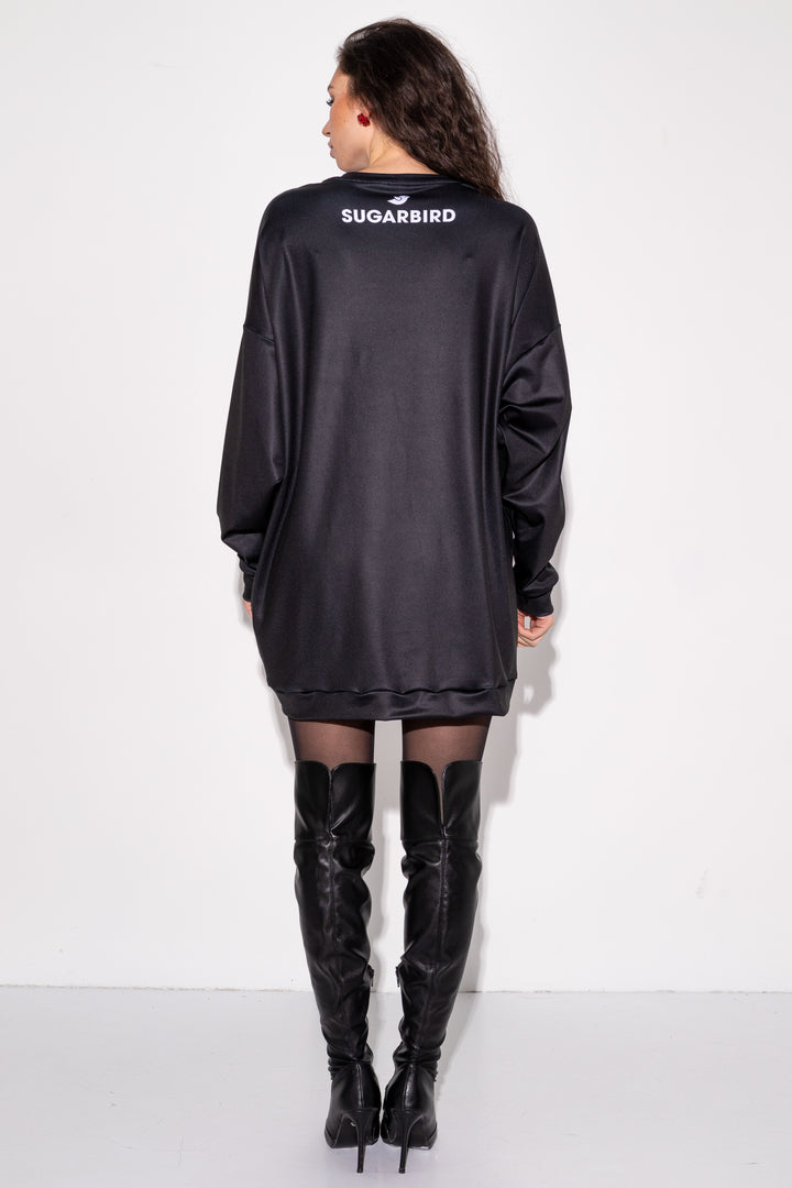 Long-sleeved, mid-thigh-length, loose, oversized sweater. Closed round neck, hem and cuffs are edged with folded straps. To the front