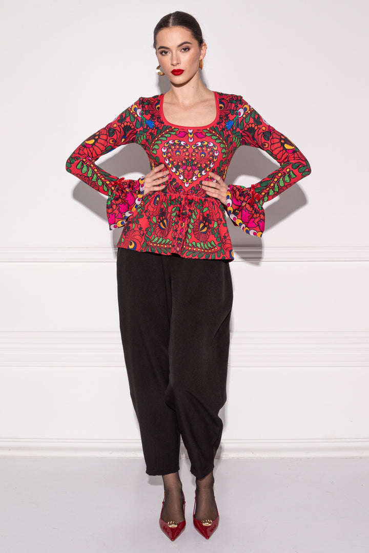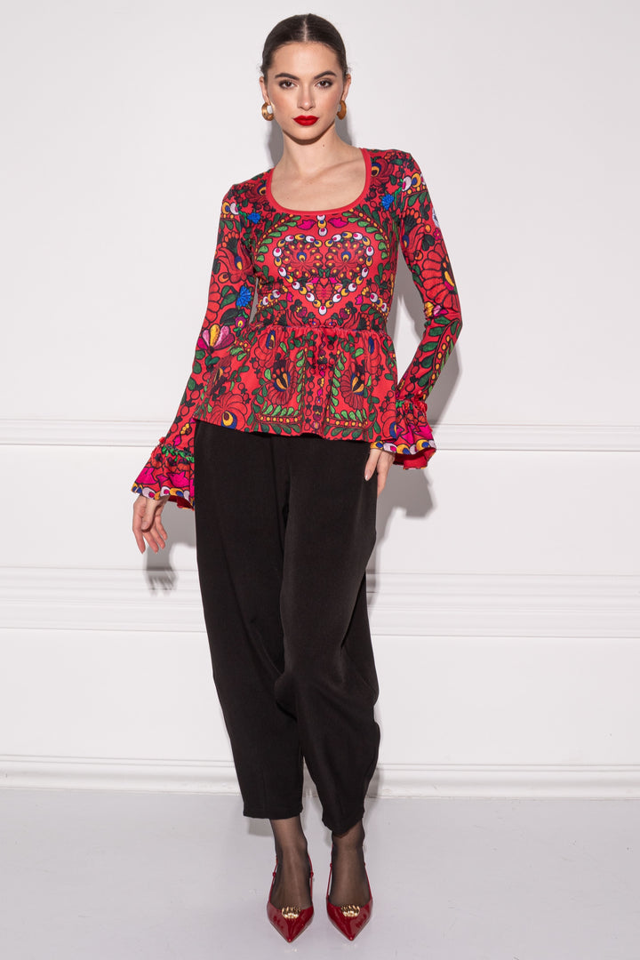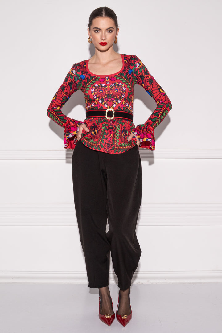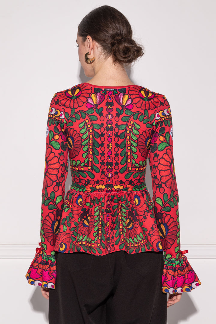 Hip-length, long-sleeved, form-fitting top. Wide neckline edged with a narrow strap. The bottom and bottom of the sleeves are decorated with a wide and drawn ruffle, and the sleeve ruffle is decorated with a bow. On the back SUGARBIRD We sewed a label with the inscription.