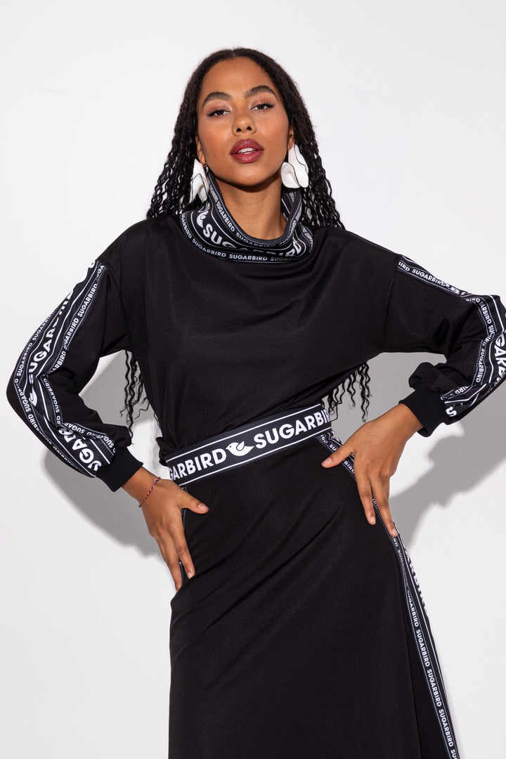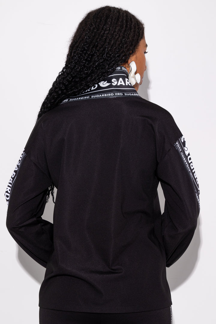 A loose-fitting, long-sleeved top that reaches below the hips. A wide, printed strap ties the neck. Separately tailored, printed inserts on the sleeves, and a front SUGARBIRD decorated with a label.