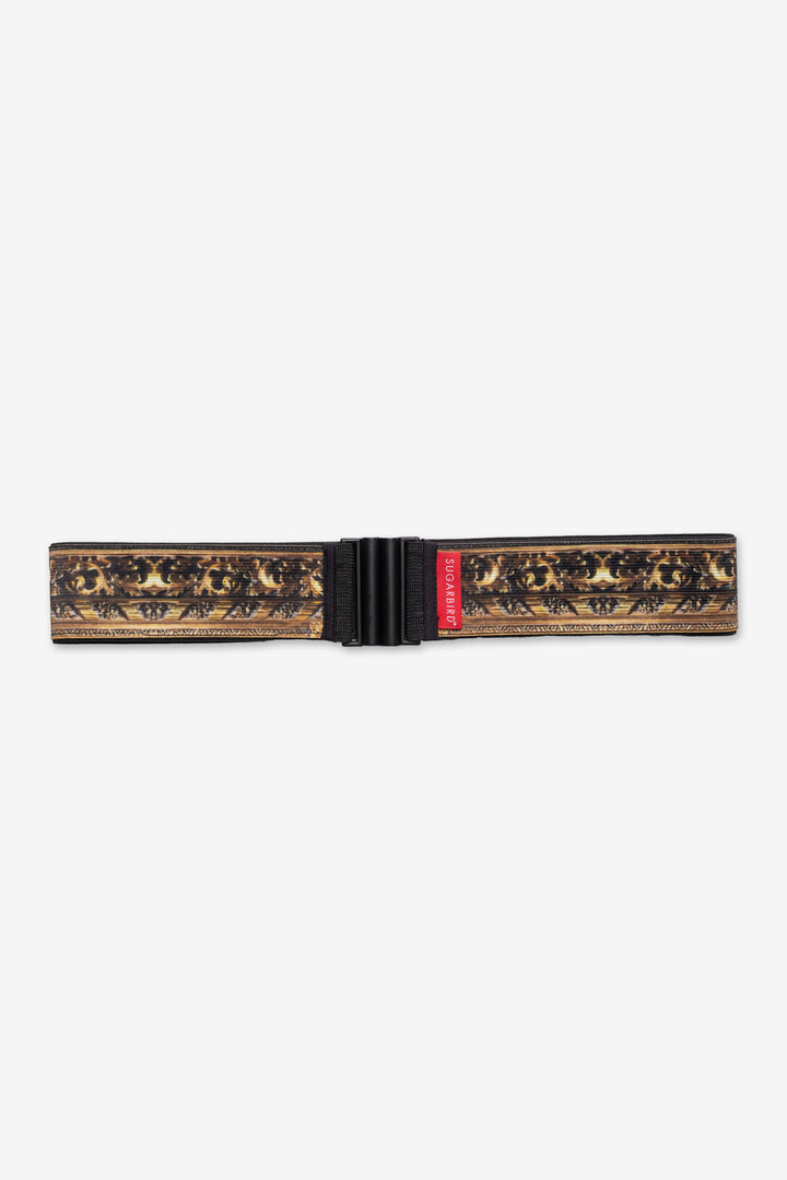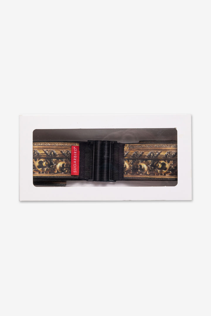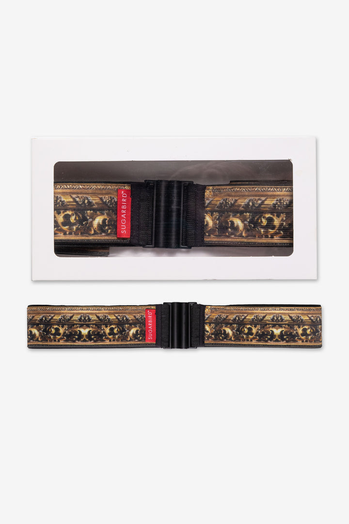 Széles, nyomott mintás gumis öv, amely fém övcsattal záródik. A csat mellett piros színű, SUGARBIRD feliratú címke díszíti. A termék stílusosan kialakított, díszdobozos csomagolásban érkezik, mely nemcsak esztétikus, hanem ízléses is.