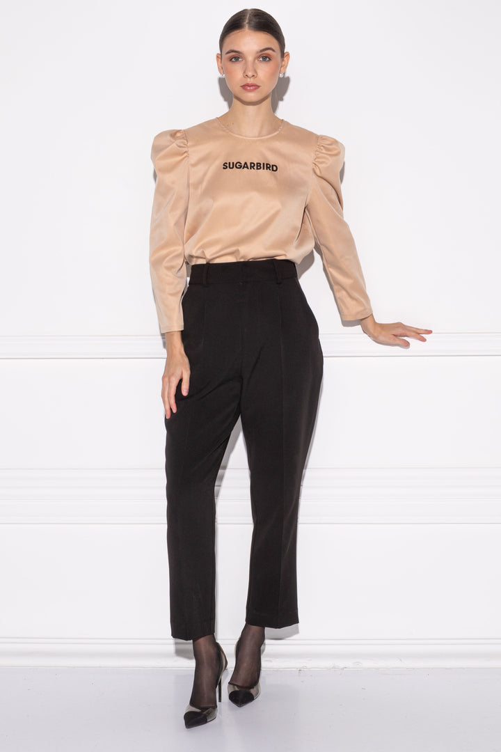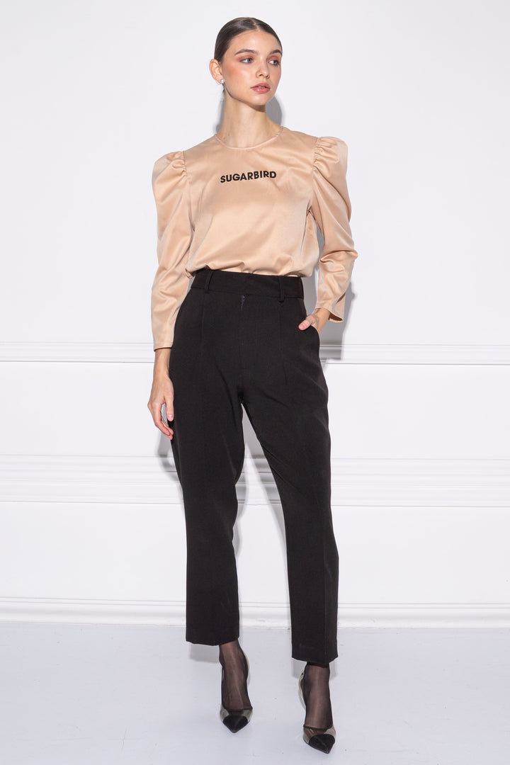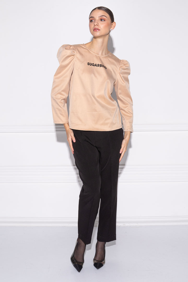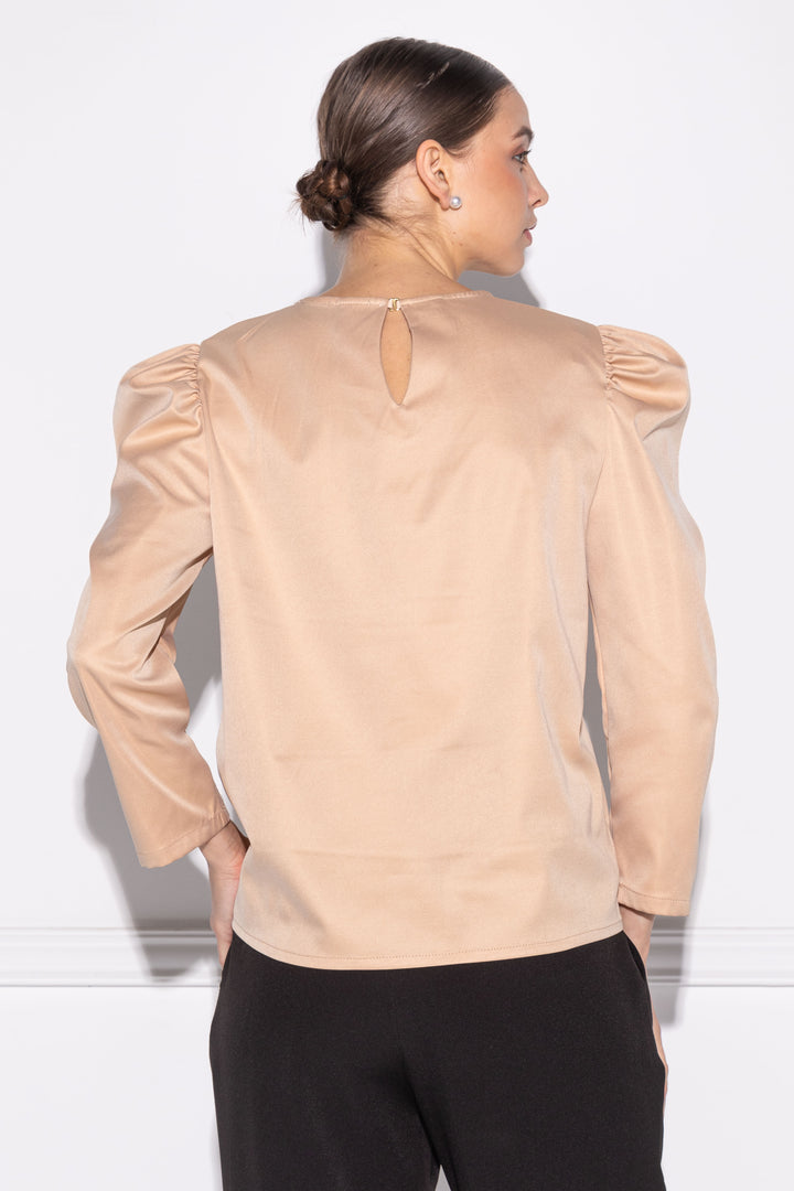 Short, puffy-sleeved shirt that falls above the hips. Closed neckline and fastens with a clasp above a slit at the back.