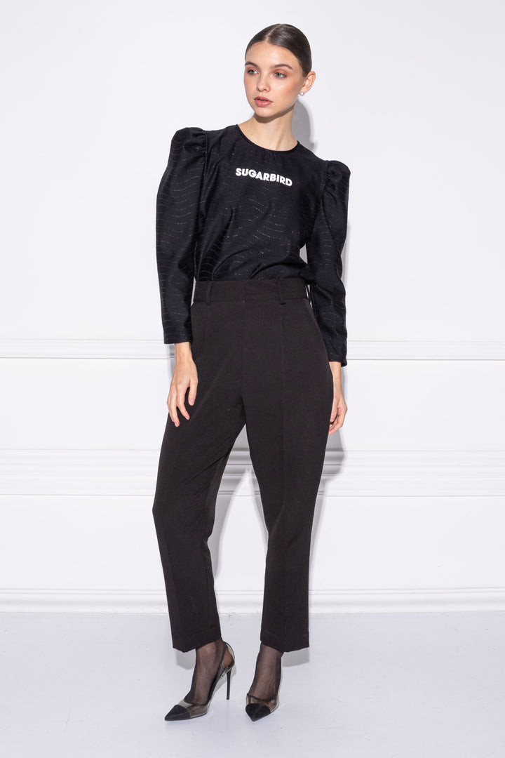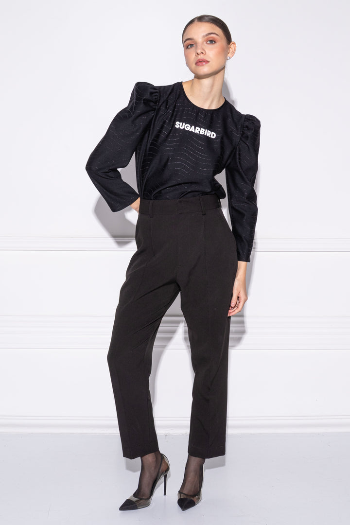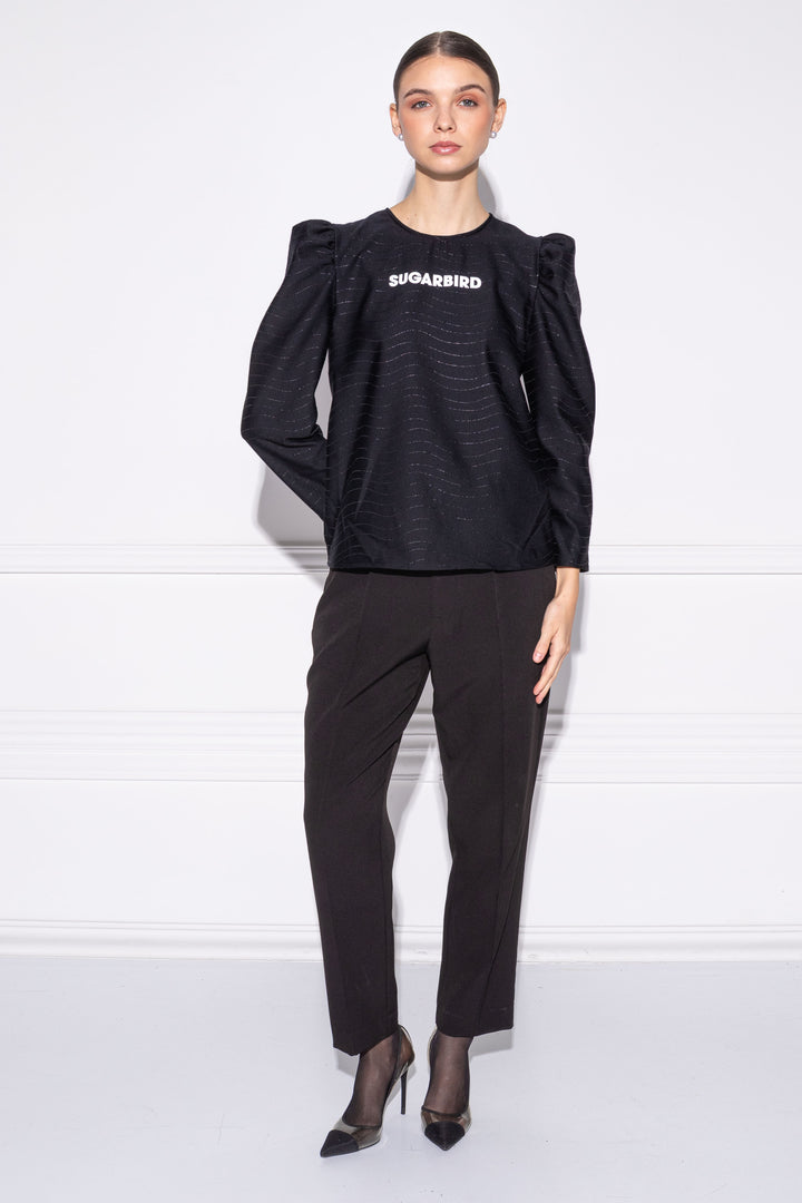 Short, puffy-sleeved shirt that falls above the hips. Closed neckline and fastens with a clasp above a slit at the back.