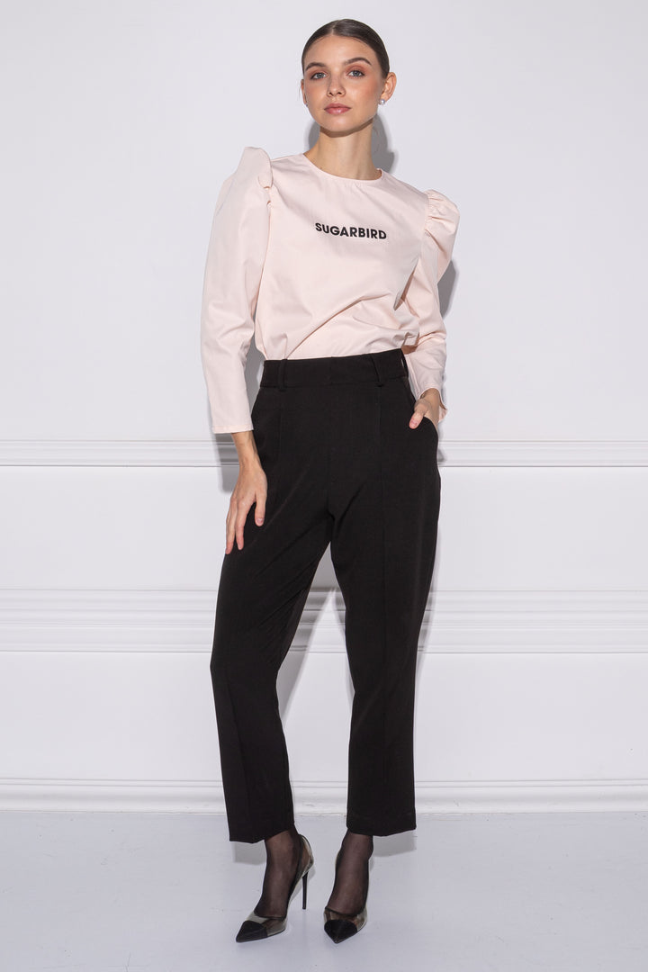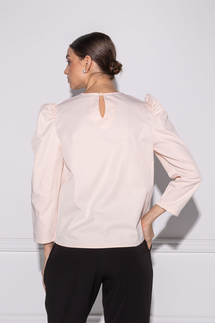 Short, puffy-sleeved shirt that falls above the hips. Closed neckline and fastens with a clasp above a slit at the back.
