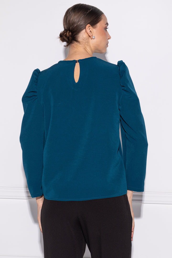 Short, puffy-sleeved shirt that falls above the hips. Closed neckline and fastens with a clasp above a slit at the back.