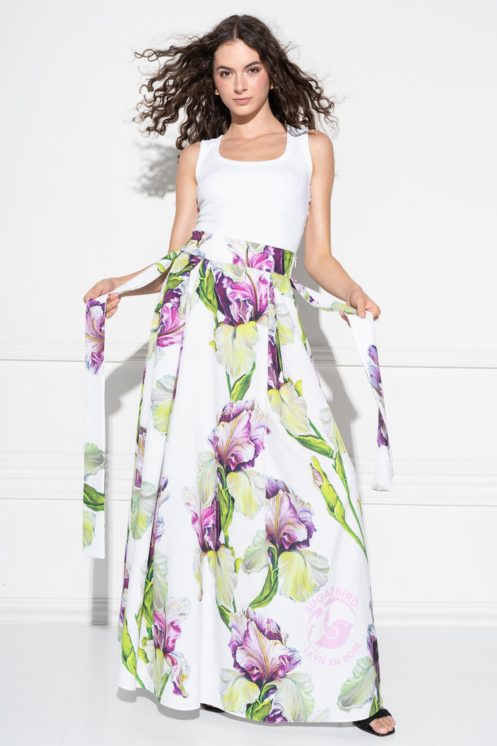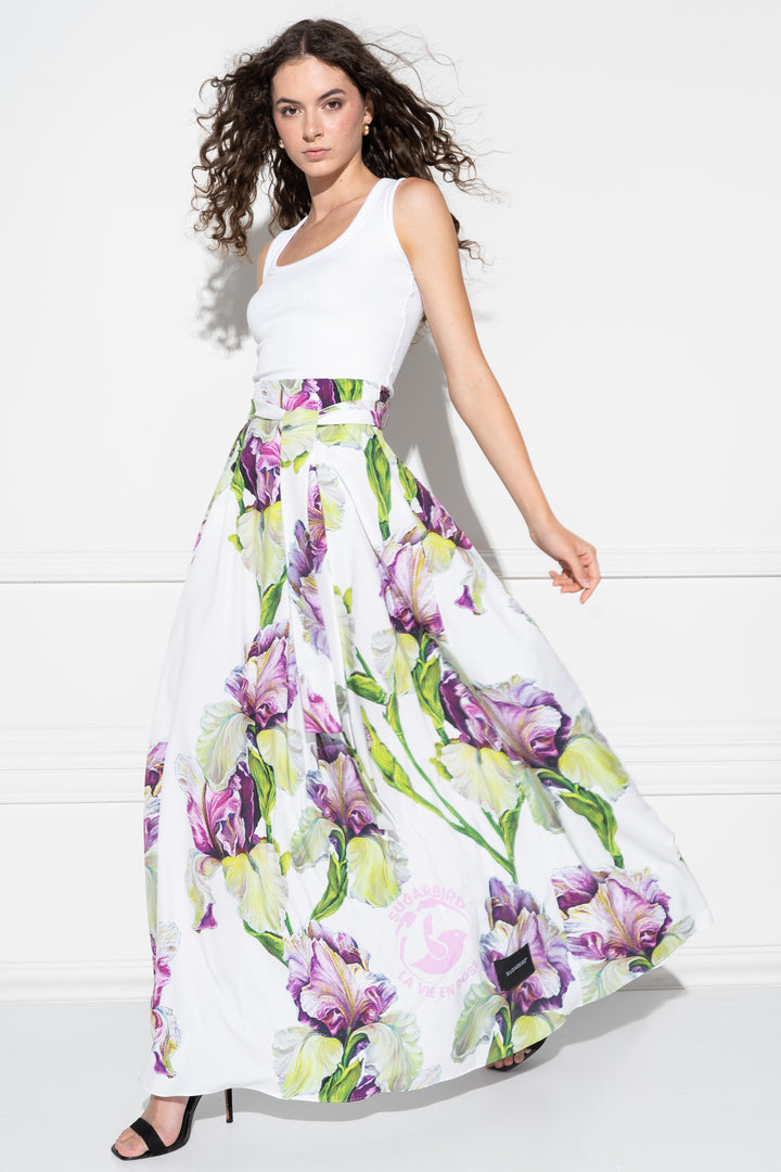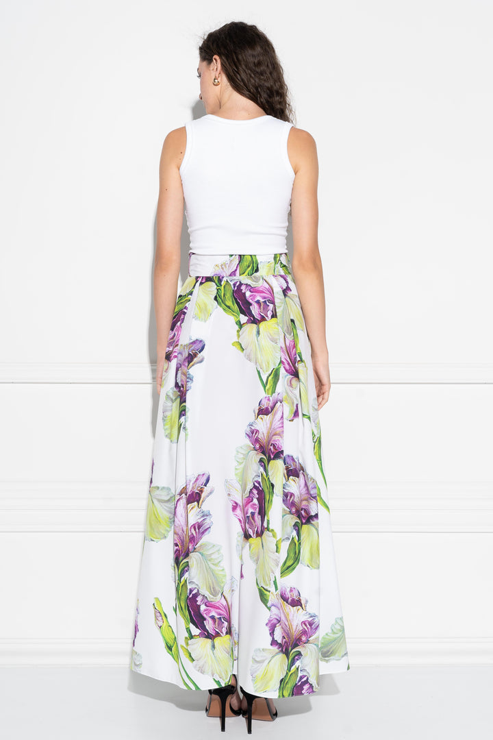 Maxi skirt with two pleats at the front and back. It opens with a zipper on the side and is decorated with a wide waistband. To the front
