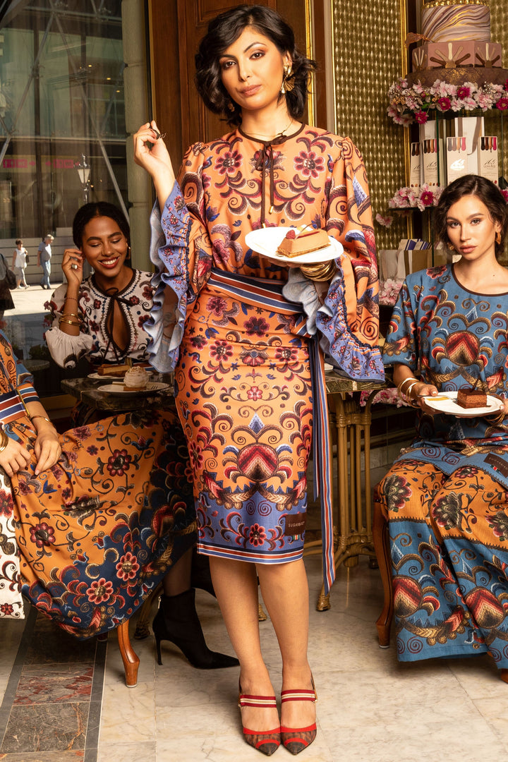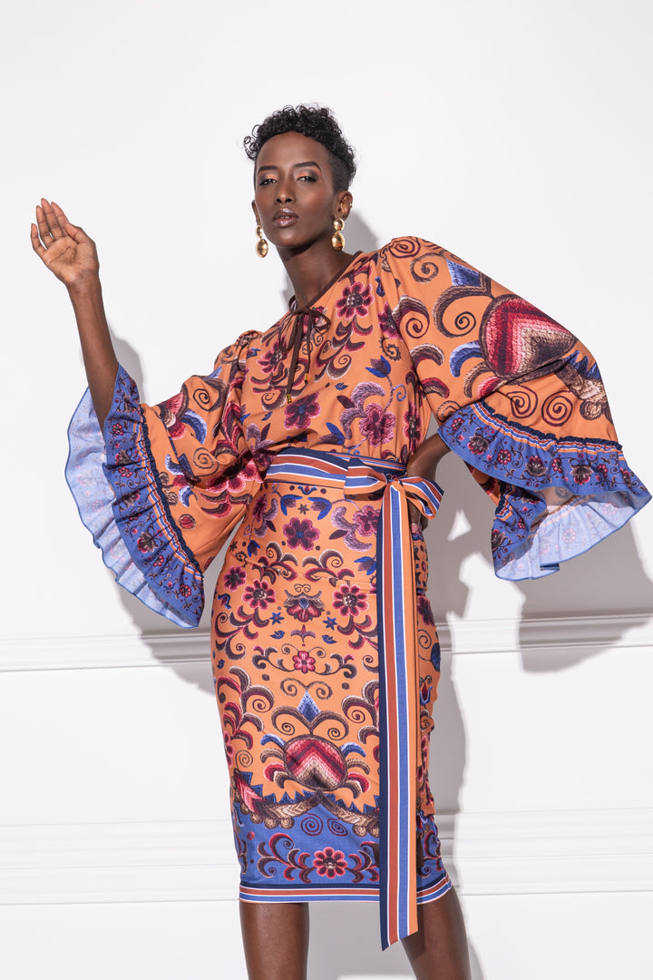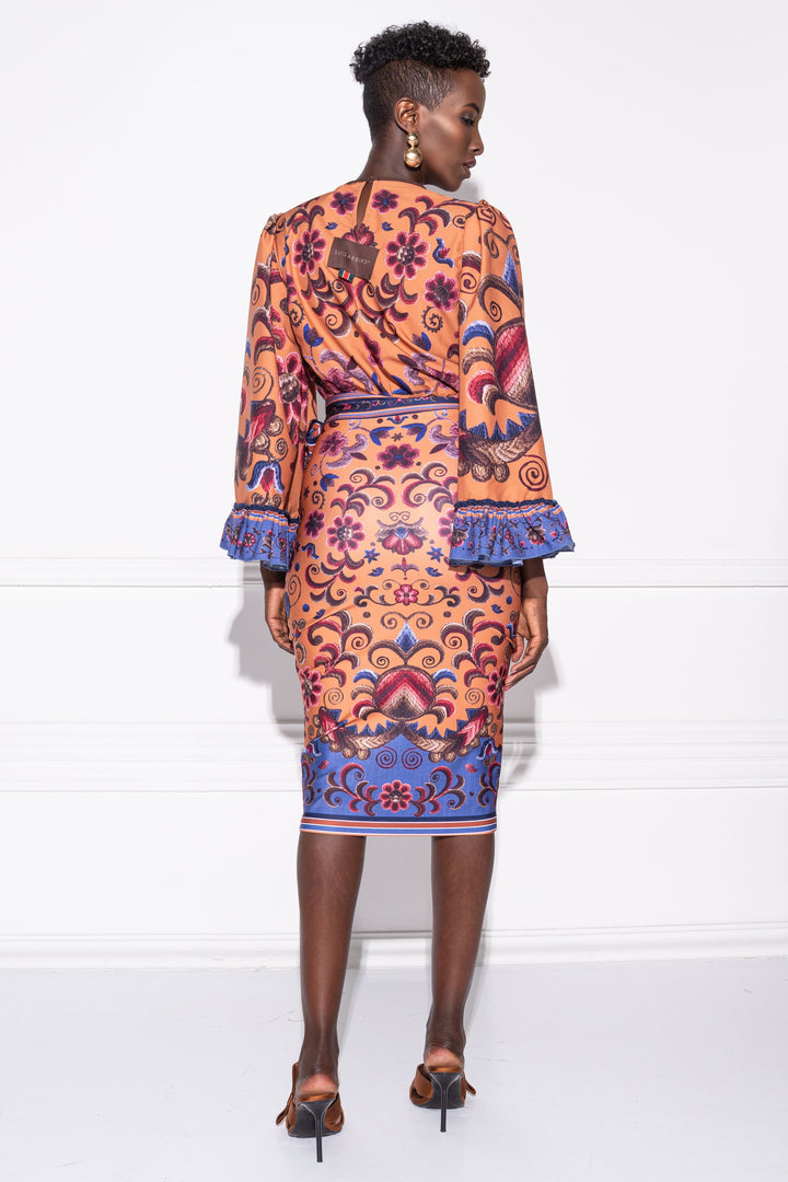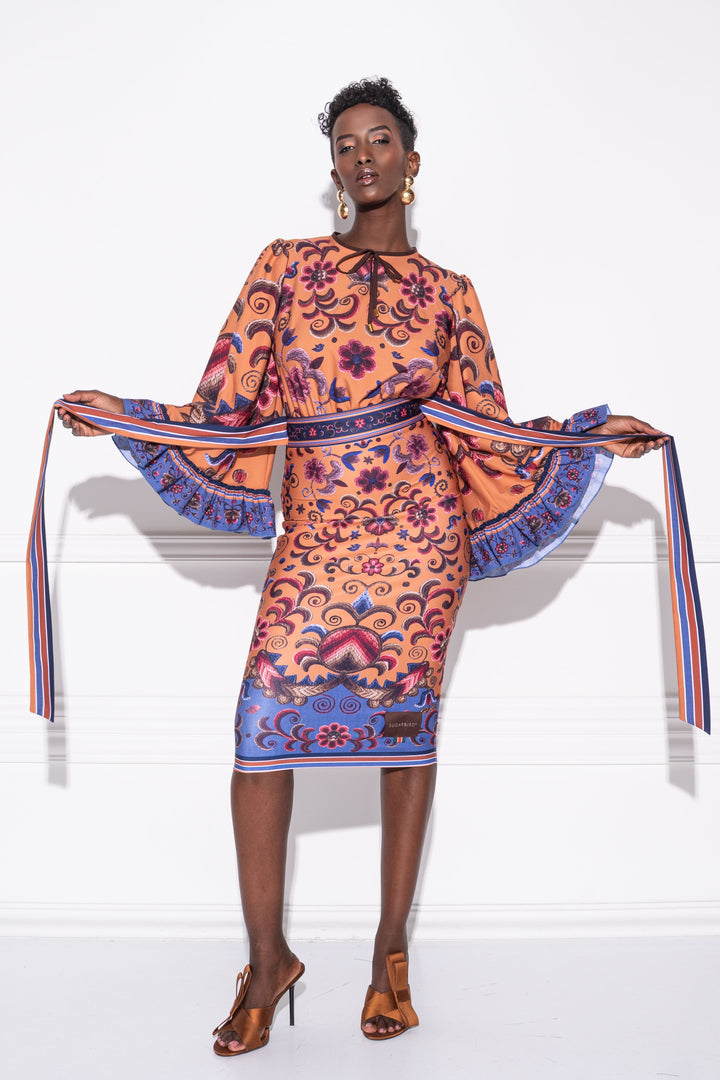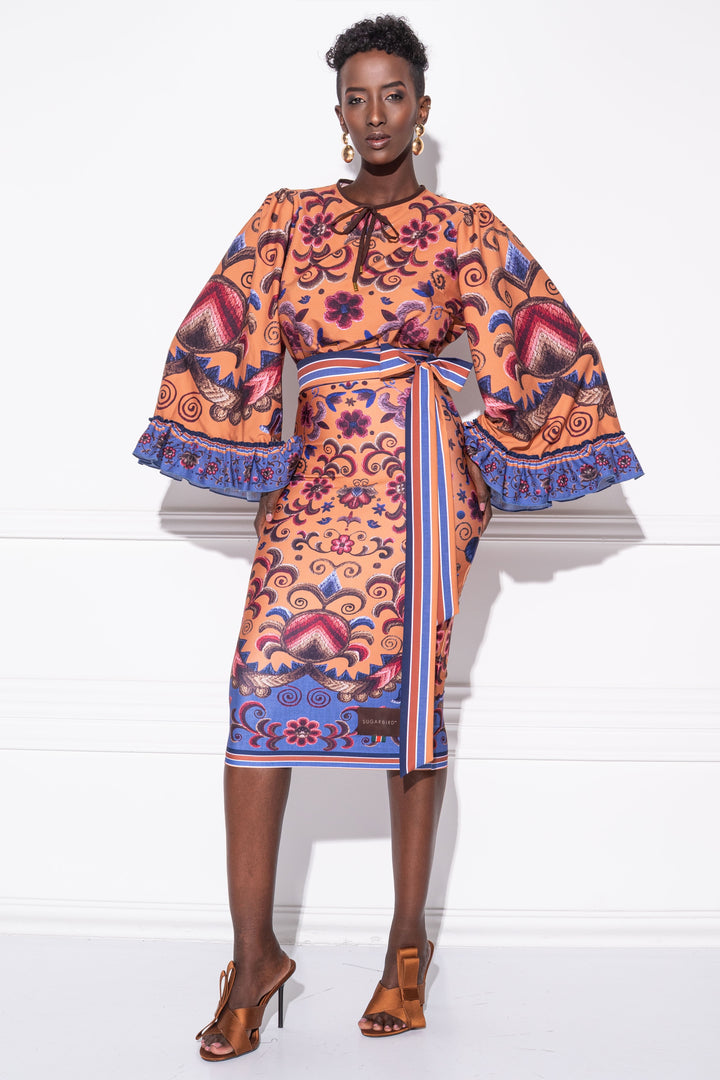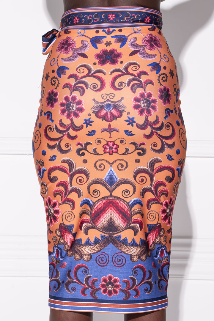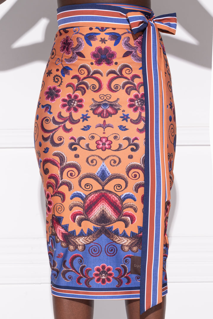 Below-the-knee length, form-fitting skirt. The waistband is fitted with a wide, long tie that can be tied into a bow if desired. It has a woven ribbon at the front. SUGARBIRD decorated with a label.