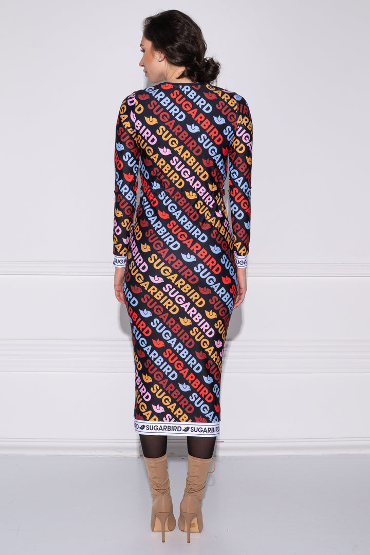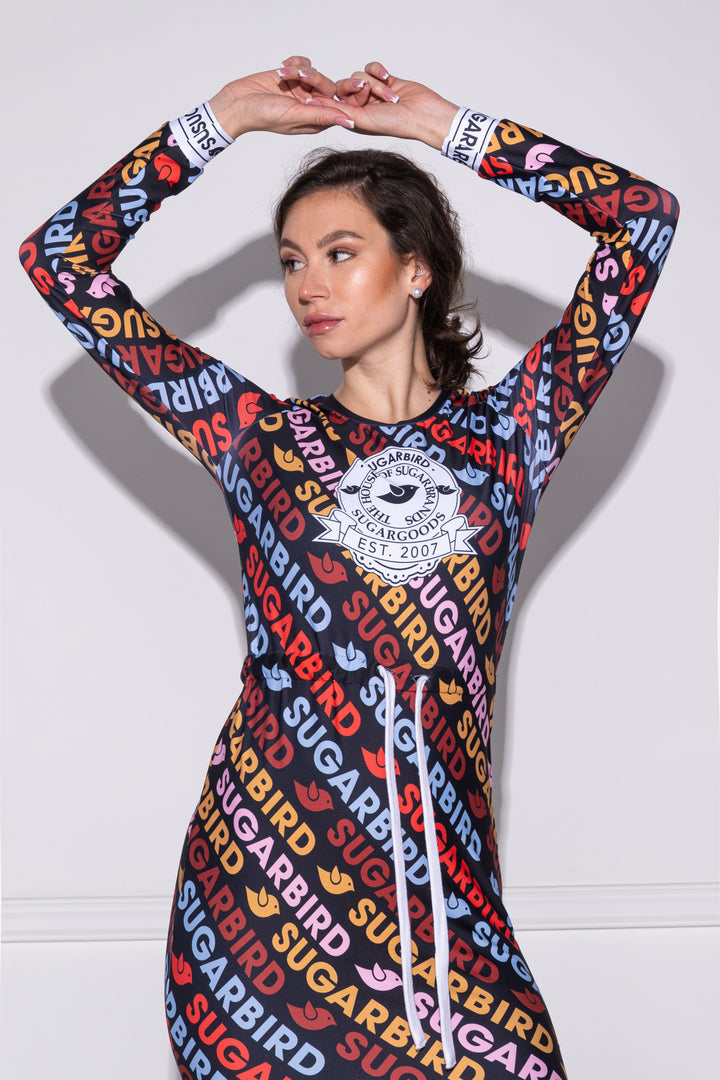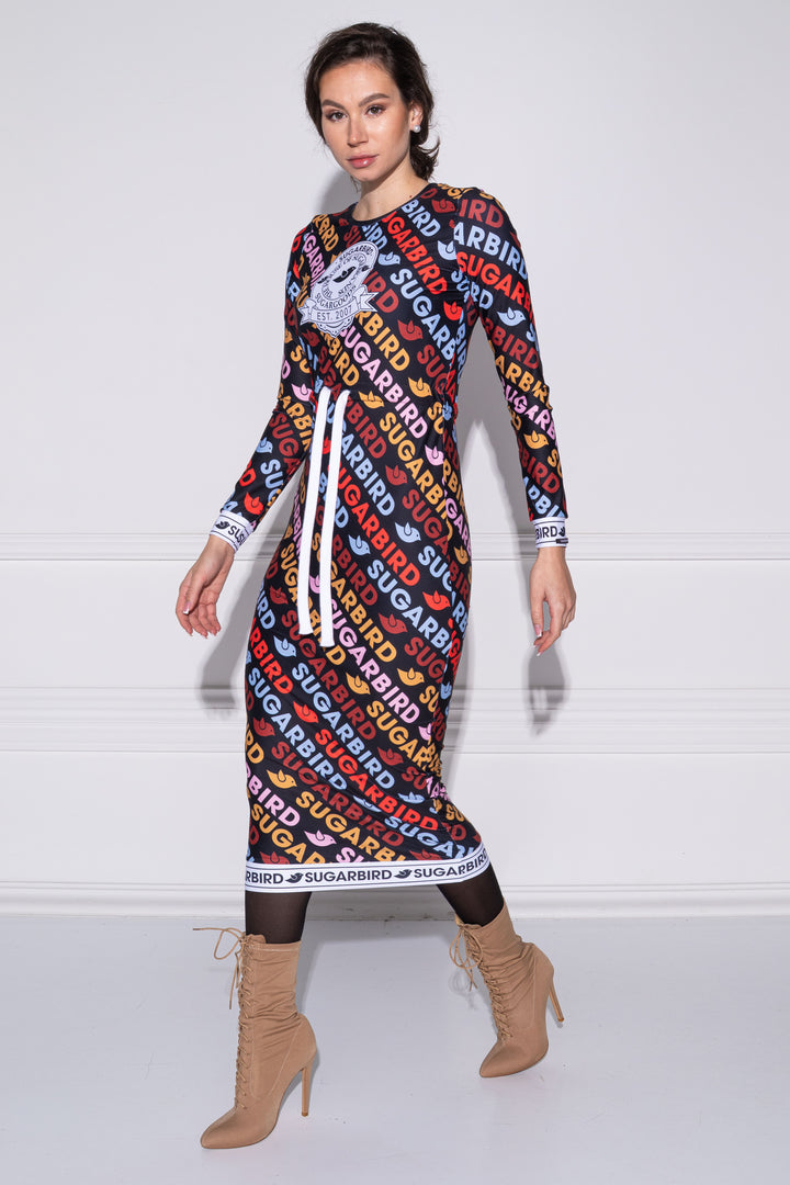 Long-sleeved, mid-calf-length, form-fitting dress. Closed round neck, hem and cuffs are hemmed with folded straps. Waist can be narrowed with a wide tie. The fit SUGARBIRD We sewed a label with the inscription.