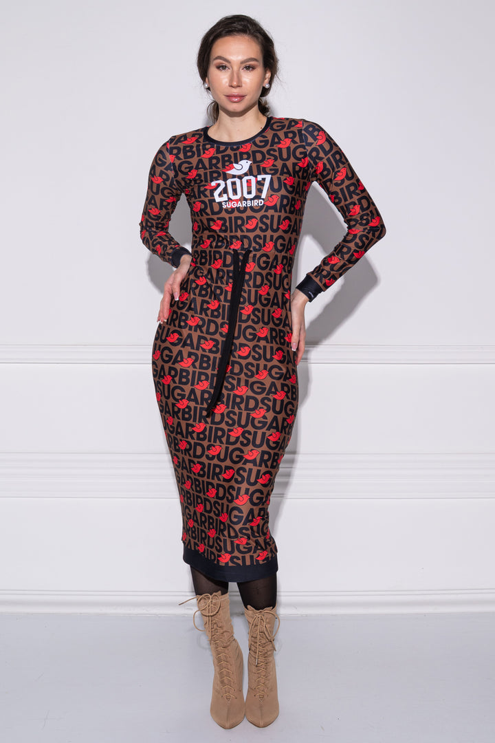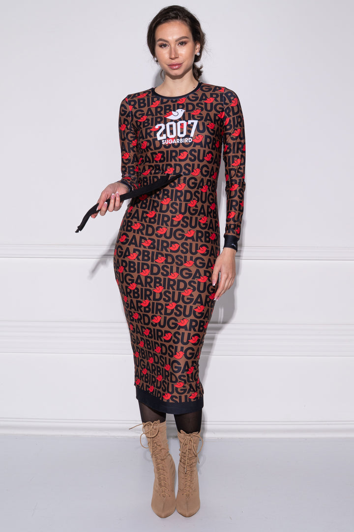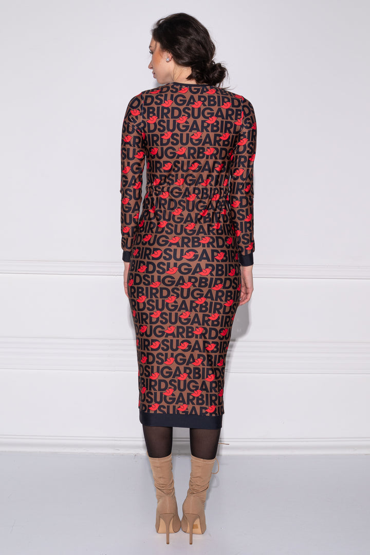 Long-sleeved, mid-calf-length, form-fitting dress. Closed round neck, hem and cuffs are hemmed with folded straps. Waist can be narrowed with a wide tie. The fit SUGARBIRD We sewed a label with the inscription.