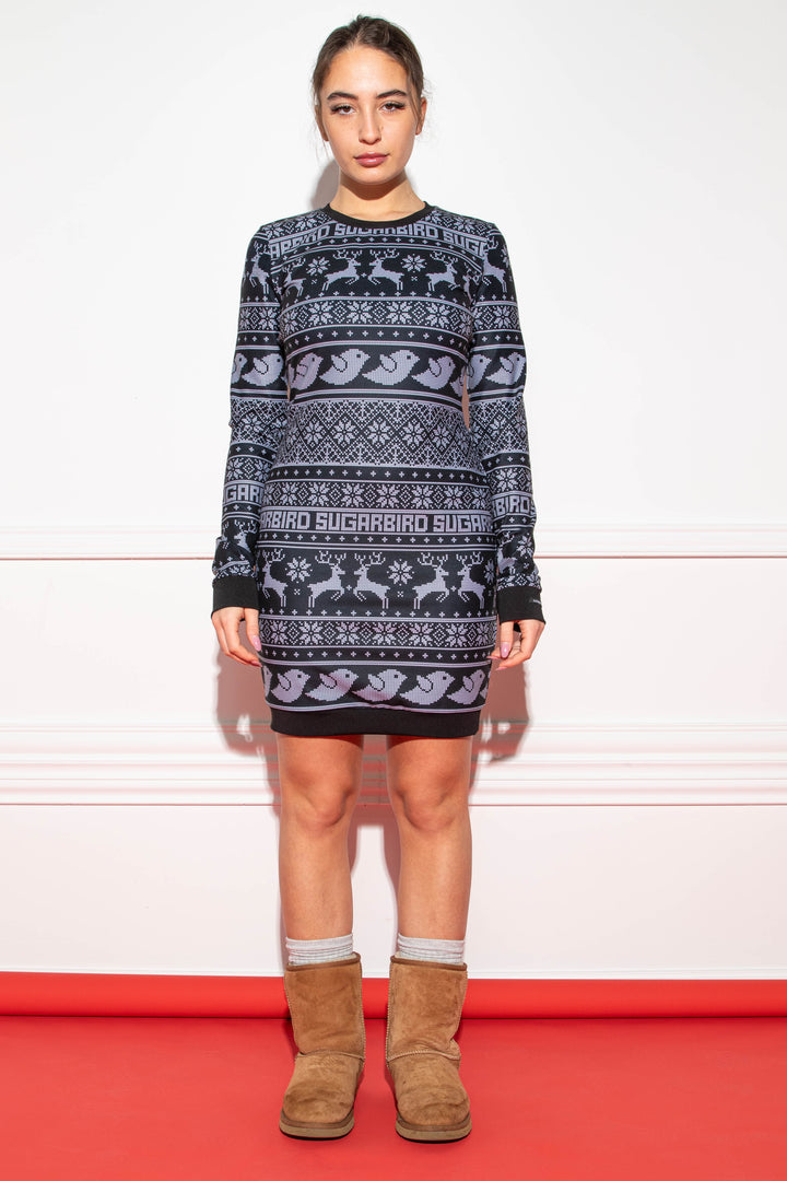 Long-sleeved, mid-thigh-length dress with a form-fitting but loose fit. The bottom, bottom of the sleeves and the closed, round neckline are edged with a folded strap. The bottom of the left sleeve is decorated with a SUGARBIRD label.