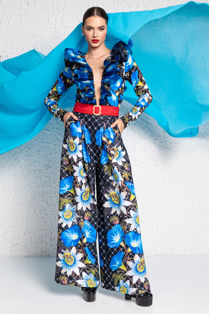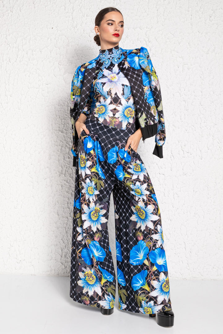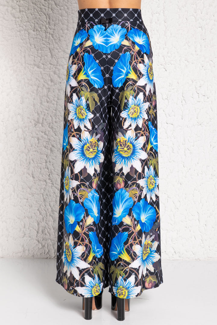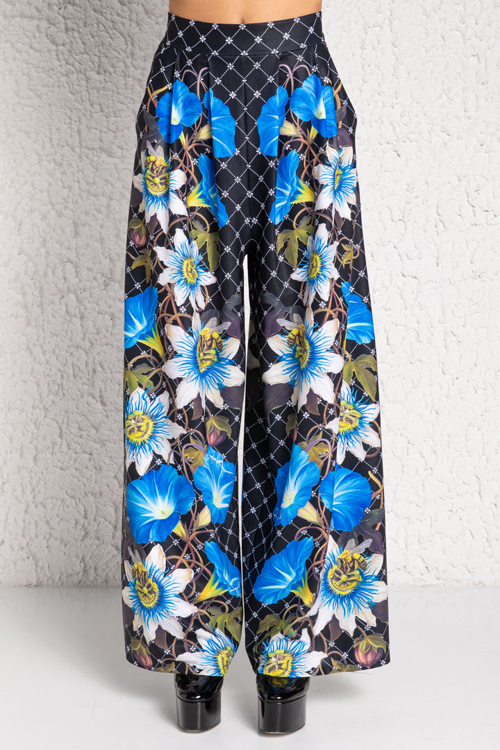 Maxi length, loose-fitting trousers with a shape-hugging waist. Side zip fastening. Pleated waist at the front. Side pockets and back pockets.