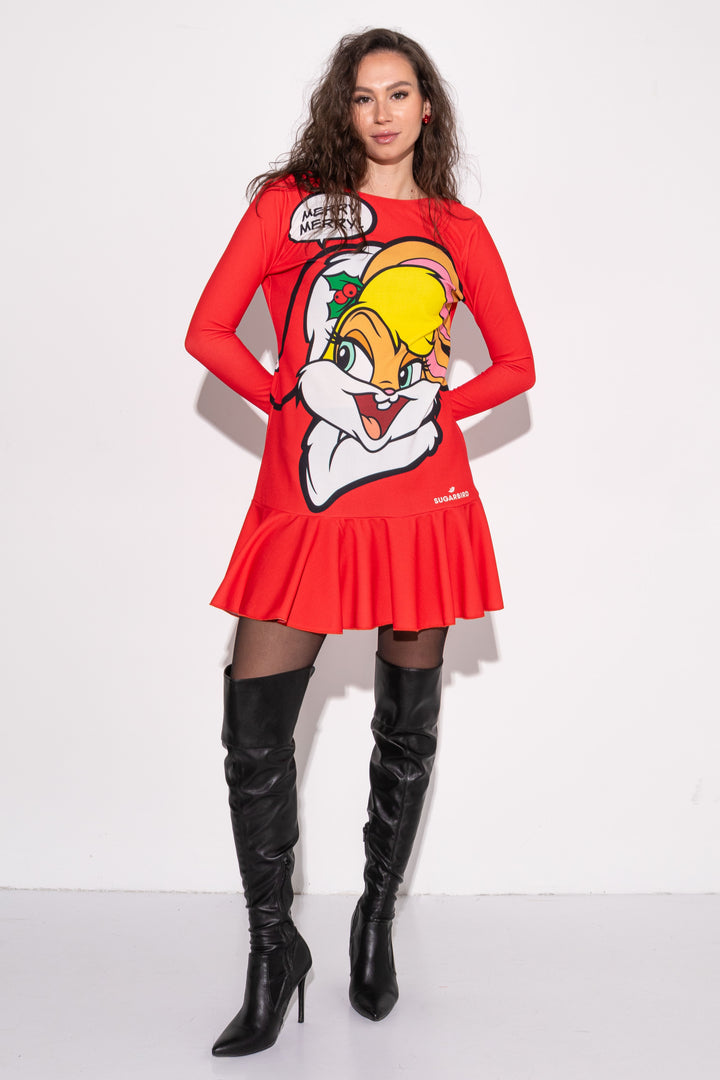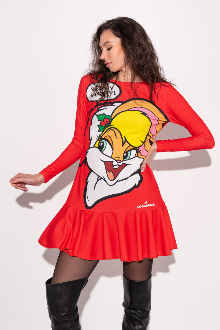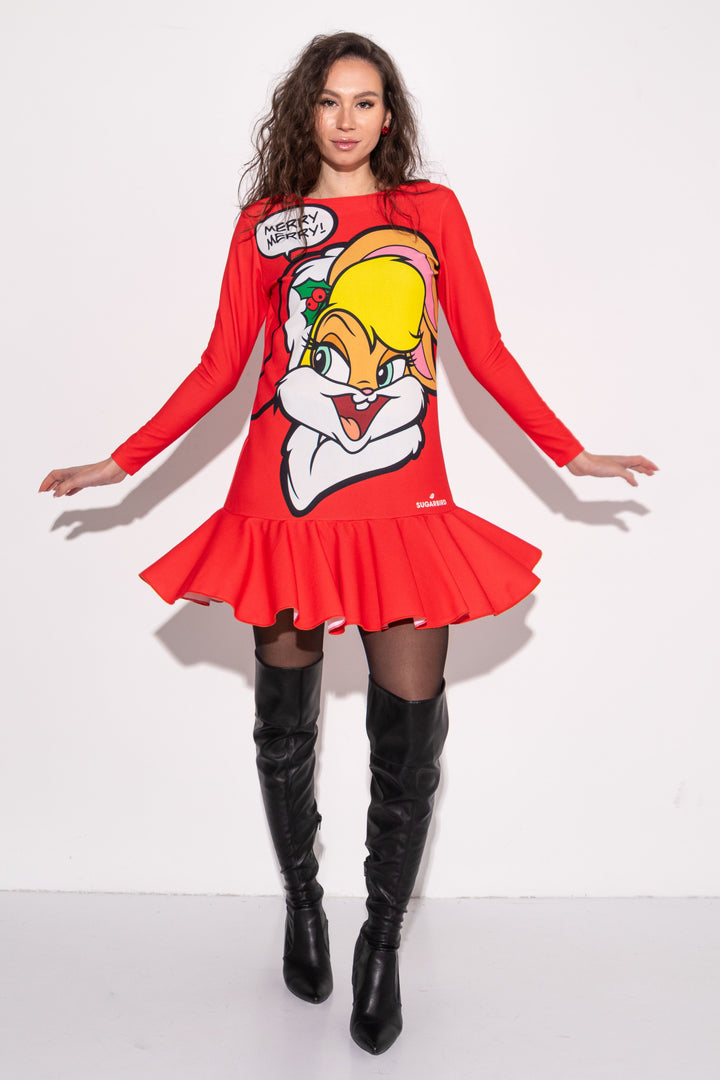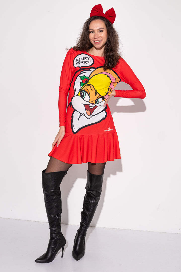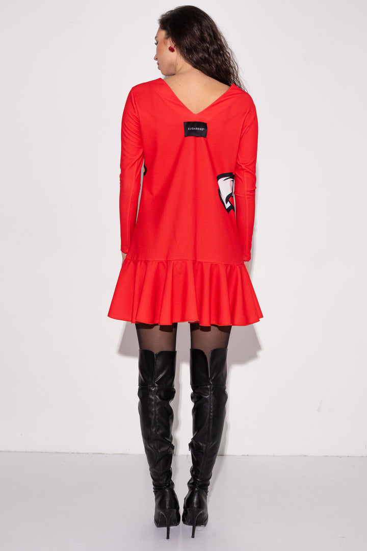 Long sleeves, above the knee, loose and straight cut tunic. The neck is closed at the front and has a "V" cut at the back. The bottom is edged with a wide ruffle. On the back SUGARBIRD We sewed a label with the inscription.