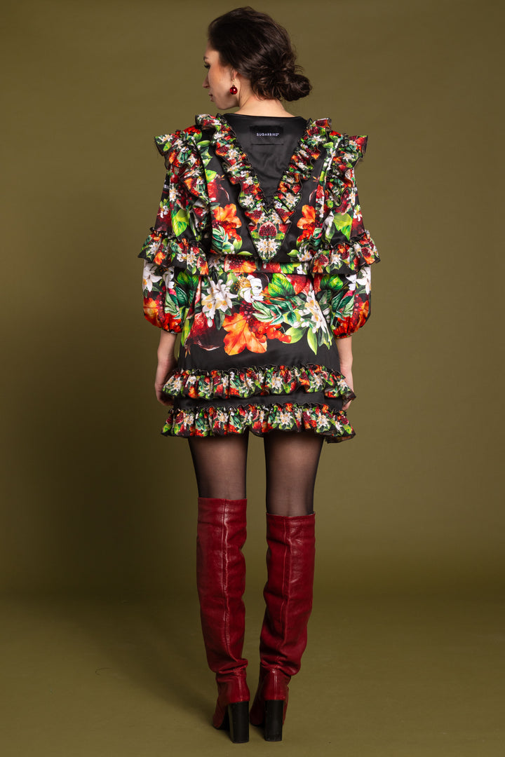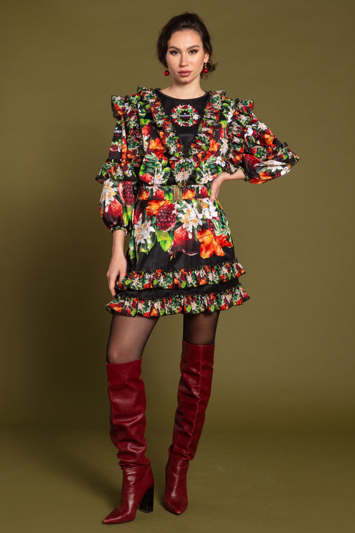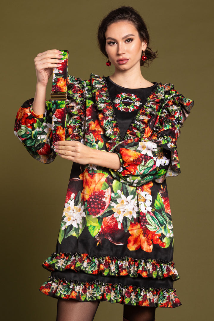 A loose-fitting dress with long, puffy sleeves that reach mid-thigh. The sleeves, shoulders and front are decorated with cut lines, and a ruffle at the bottom of the skirt. The bottom of the sleeves is elasticated, and the closed, round neck is edged with a narrow strap. On the back SUGARBIRD We sewed a label with the inscription.
