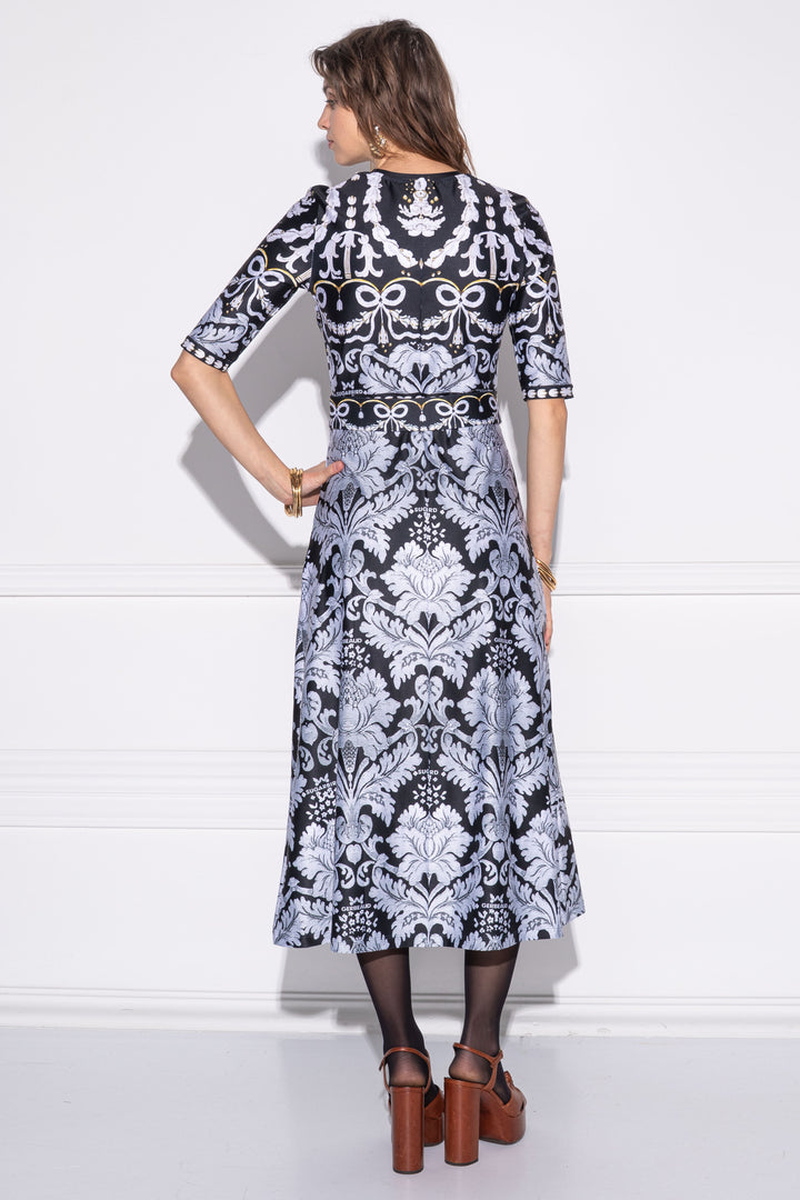 Three-quarter-length, mid-calf-length, form-fitting dress with a closed round neckline and a folded-over strap. The skirt is flared in an A-line.