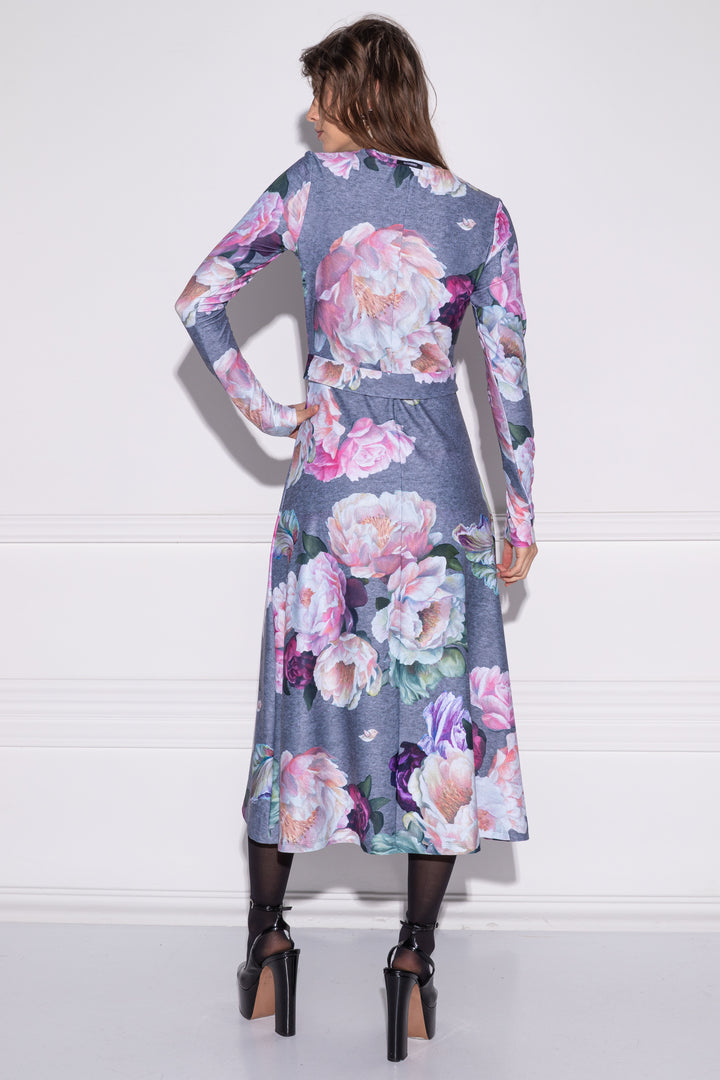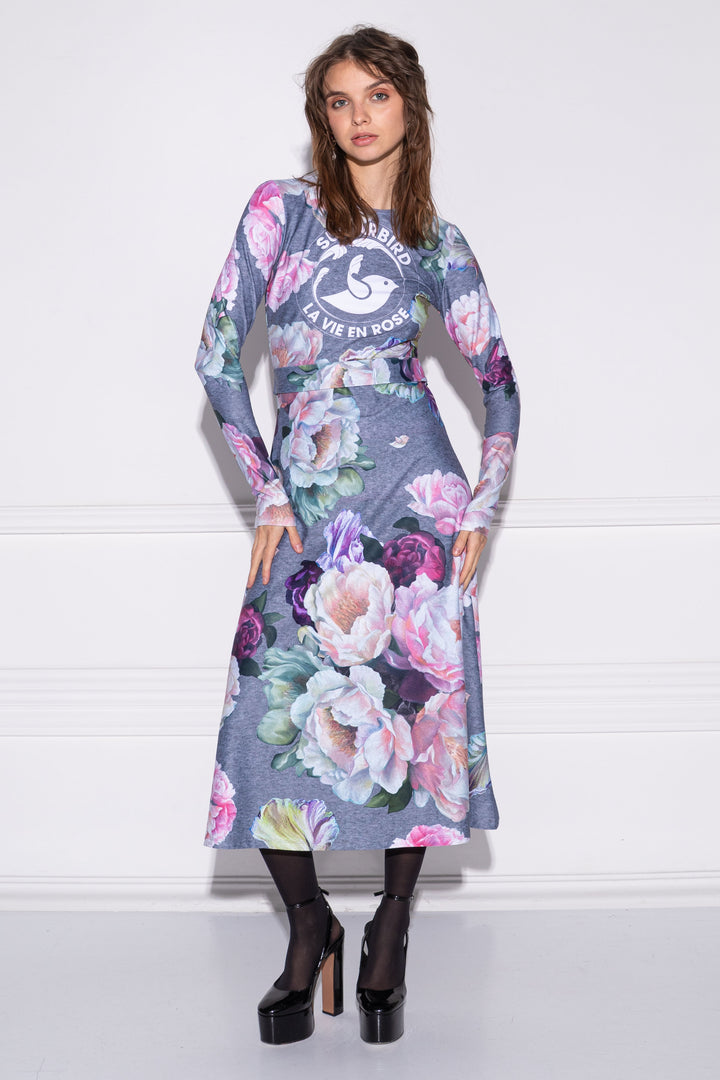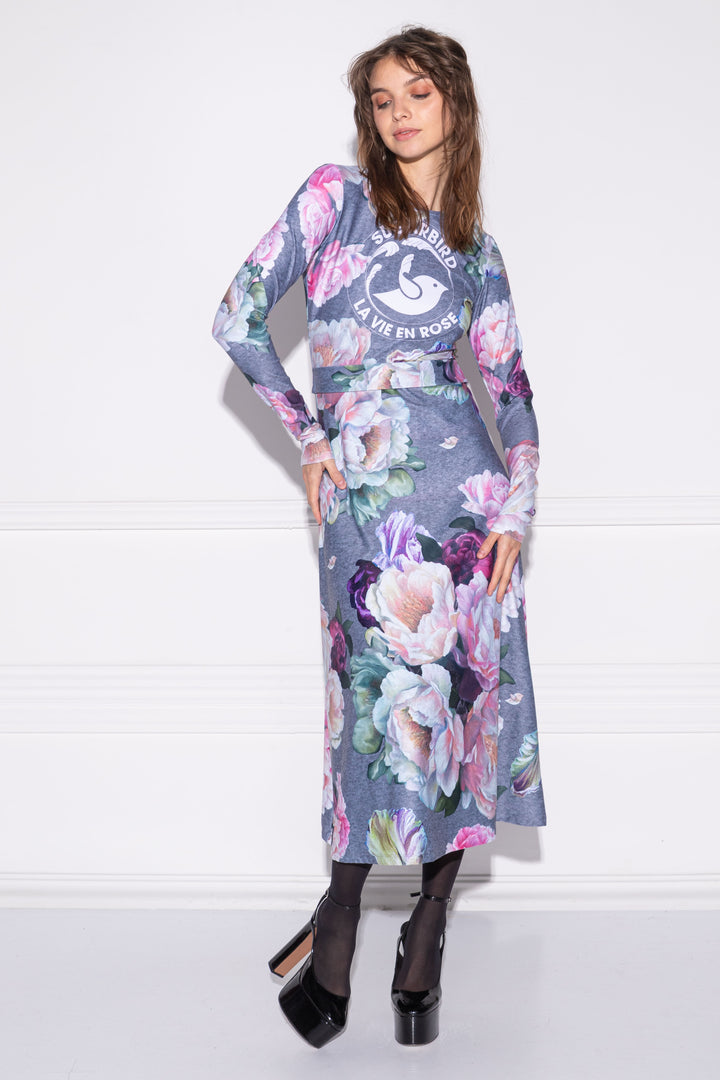 Long-sleeved, mid-calf-length, form-fitting dress. Closed round neck with folded straps. Skirt part is flared "A" line. Belted at the waist. Back SUGARBIRD We sewed a label with the inscription.