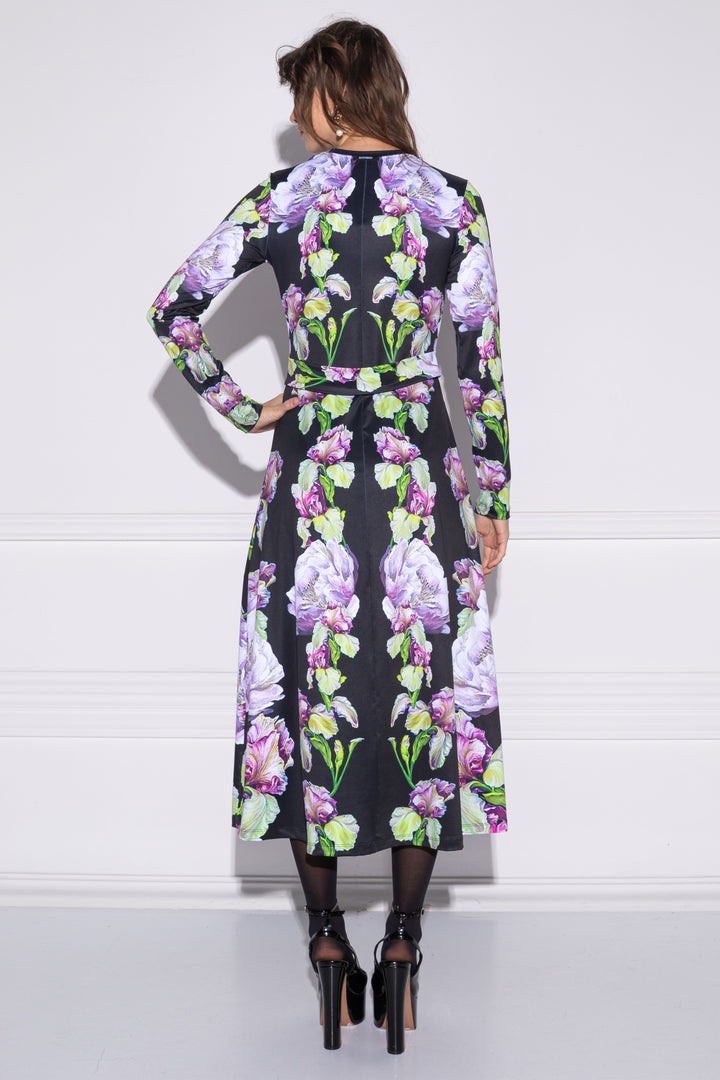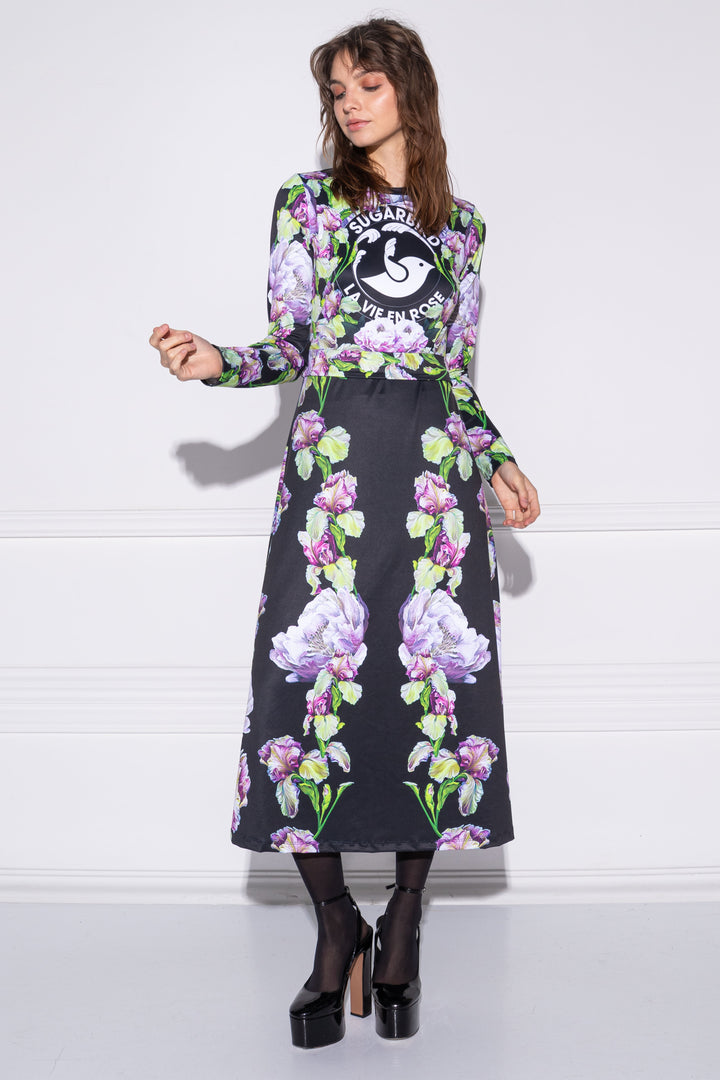 Long-sleeved, mid-calf-length, form-fitting dress. Closed round neck with folded straps. Skirt part is flared "A" line. Belted at the waist. Back SUGARBIRD We sewed a label with the inscription.
