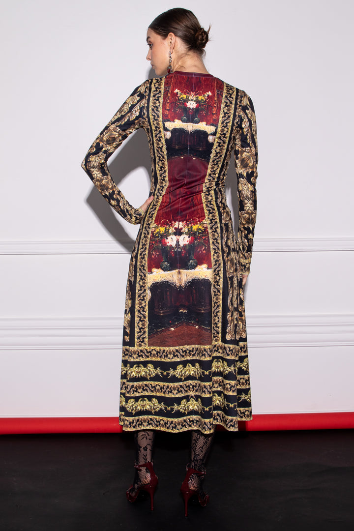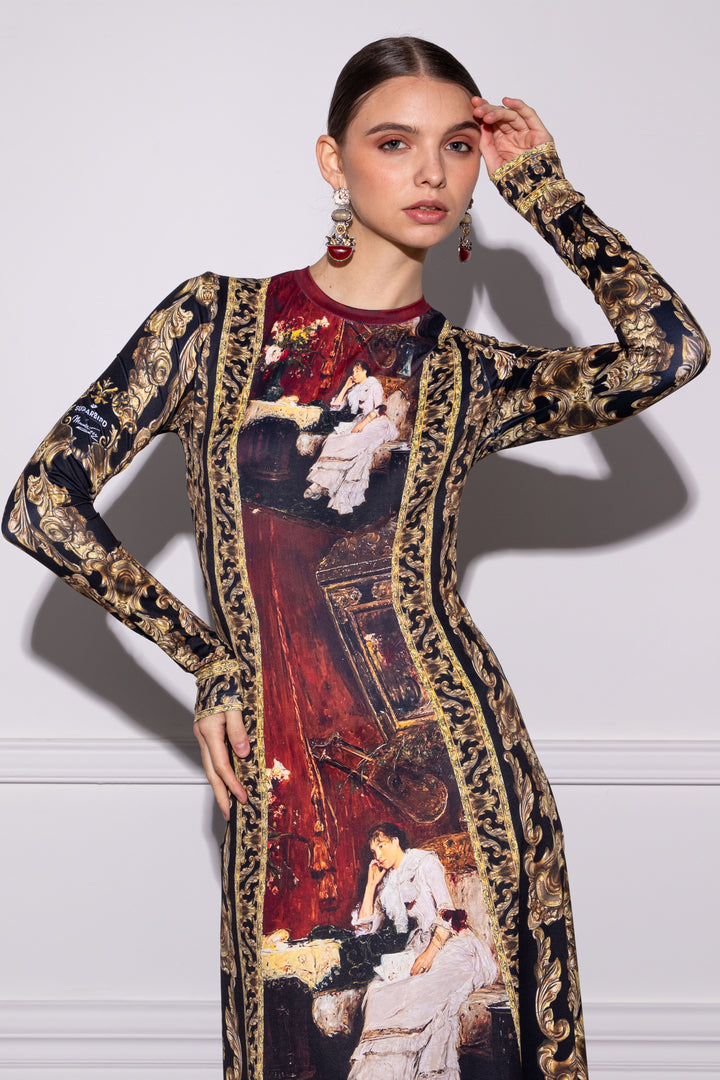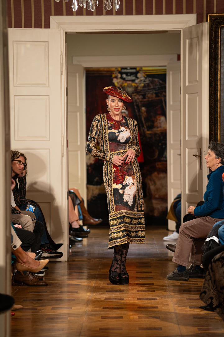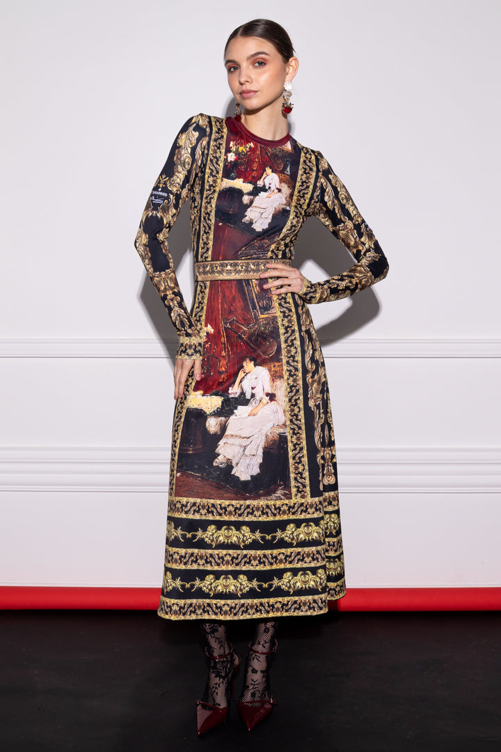 Hosszú ujjú, vádliközép hosszúságú, alak követő ruha. Zárt kerek nyaka félbehajtott pánttal szegett. Szoknya része bővülő „A” vonalú. A ruhához egy külön álló gumis öv is készült, amely fém övcsattal záródik.