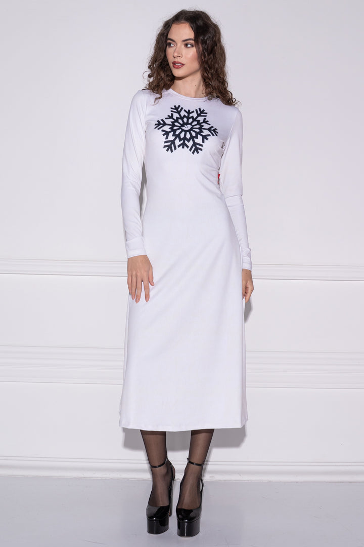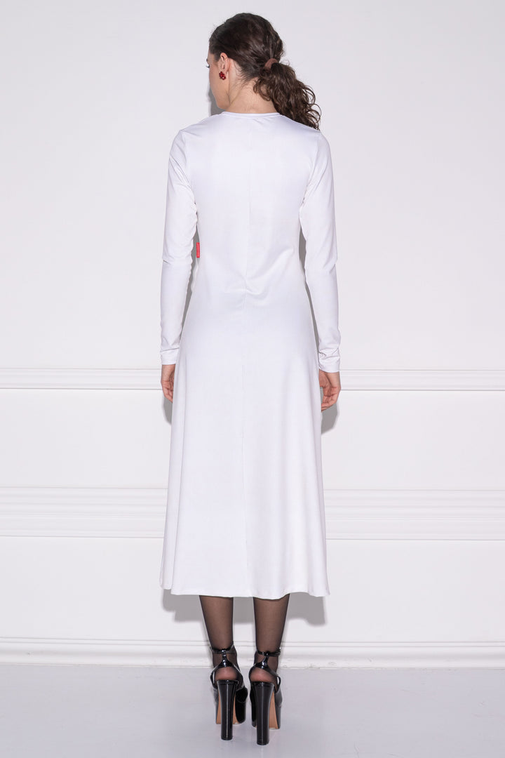 Long-sleeved, mid-calf-length, form-fitting dress. Closed round neck with folded straps. Skirt part is flared A-line. The style is