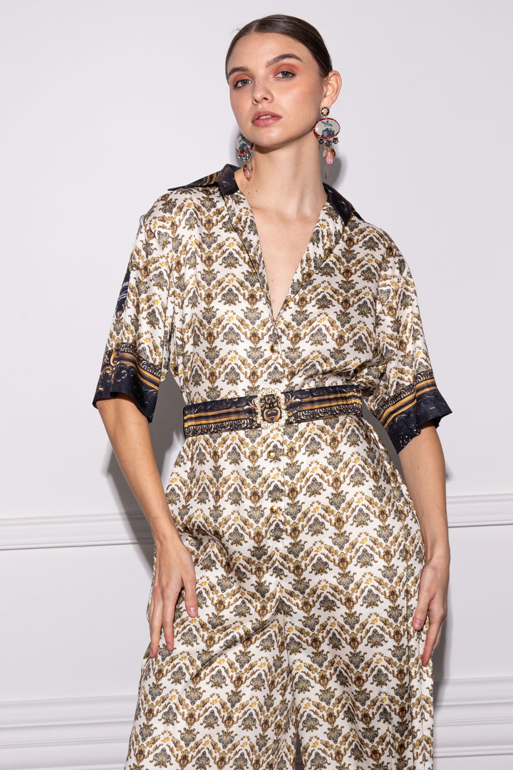 Hosszú és bő szárú, könyök feletti ujjhosszúságú, laza fazonú overál. Nyakát szabott gallér szegi, elején gombokkal záródik. Az overálhoz egy külön álló gumis öv is készült, amely fém övcsattal záródik.