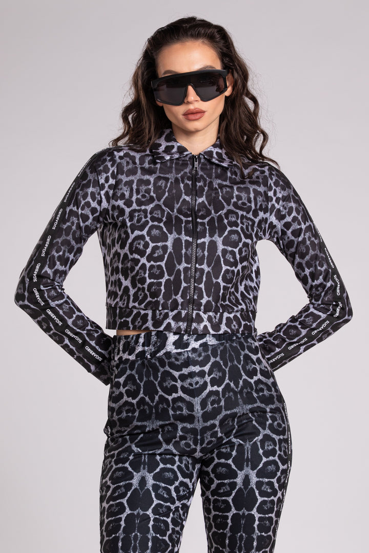 Waist-length, long-sleeved, form-fitting top. Zip-up front, wide collar. Sleeves SUGARBIRD There are ribbons with the inscription running along it, and a label is decorated in the middle of the back.