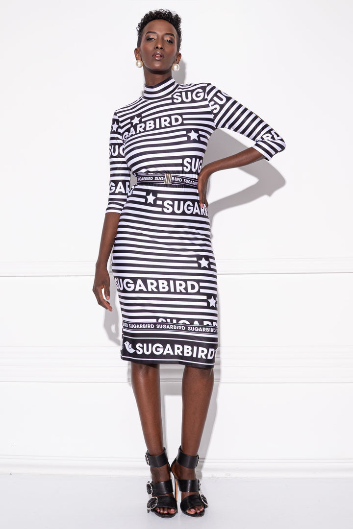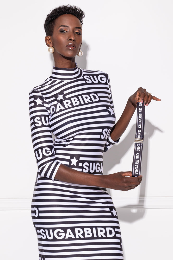 Below-the-knee length, three-quarter-length, form-fitting dress. The neck is framed by a wide turtleneck strap. The dress also comes with a separate elastic belt that closes with a metal belt buckle. Side SUGARBIRD We sewed a label with the inscription.