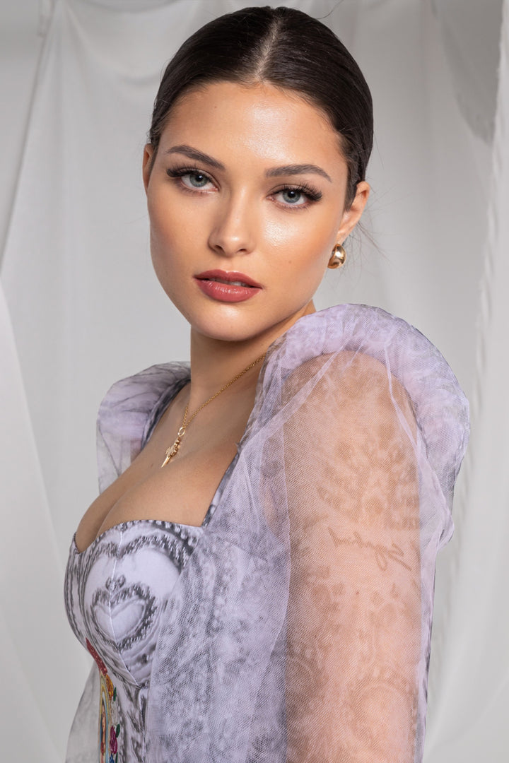 Below-the-knee length, form-fitting dress with long, puffy sleeves. The bust is tailored, and the shoulders are connected at the back by a narrow, adjustable strap. The shoulders are drawn, and the bottom of the sleeves is elasticated. The slit at the top and bottom of the center back can be opened with a zipper. To the front SUGARBIRD We sewed a label with the inscription.