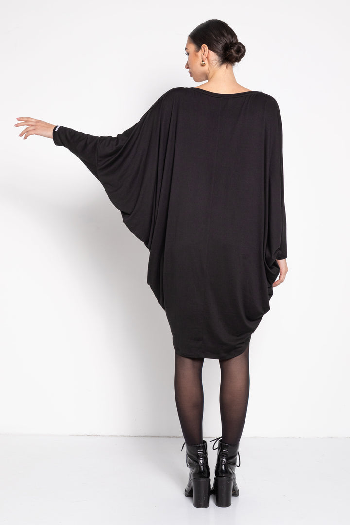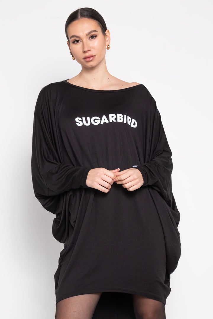 Combközépig érő, hosszú ujjú, bő fazonú tunika. Széles kivágású nyaka keskeny pánttal szegett. Ujján SUGARBIRD feliratú címkével díszítettük.
