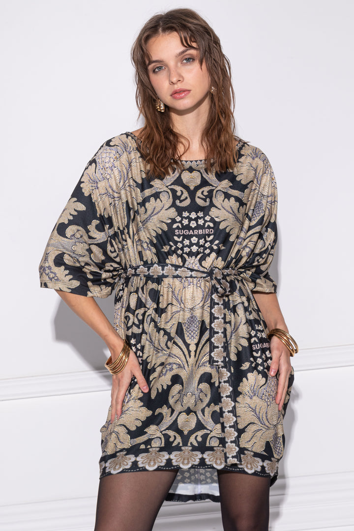 Combközépig érő, ujjatlan, bő fazonú tunika. Széles kivágású nyaka keskeny pánttal szegett. Hosszú kötőjével derékra szűkíthető a fazon. Hátán SUGARBIRD feliratú címkével díszítettük.