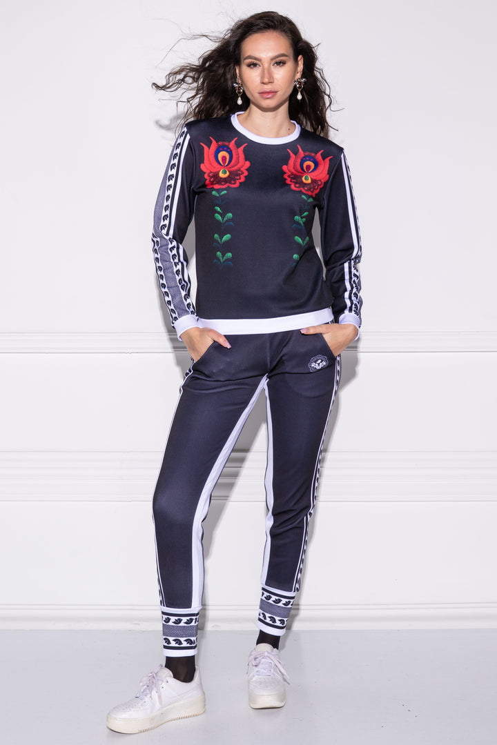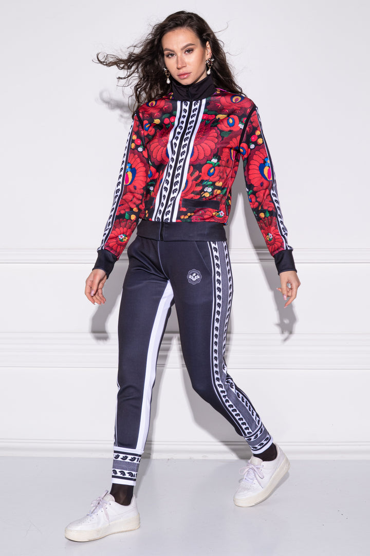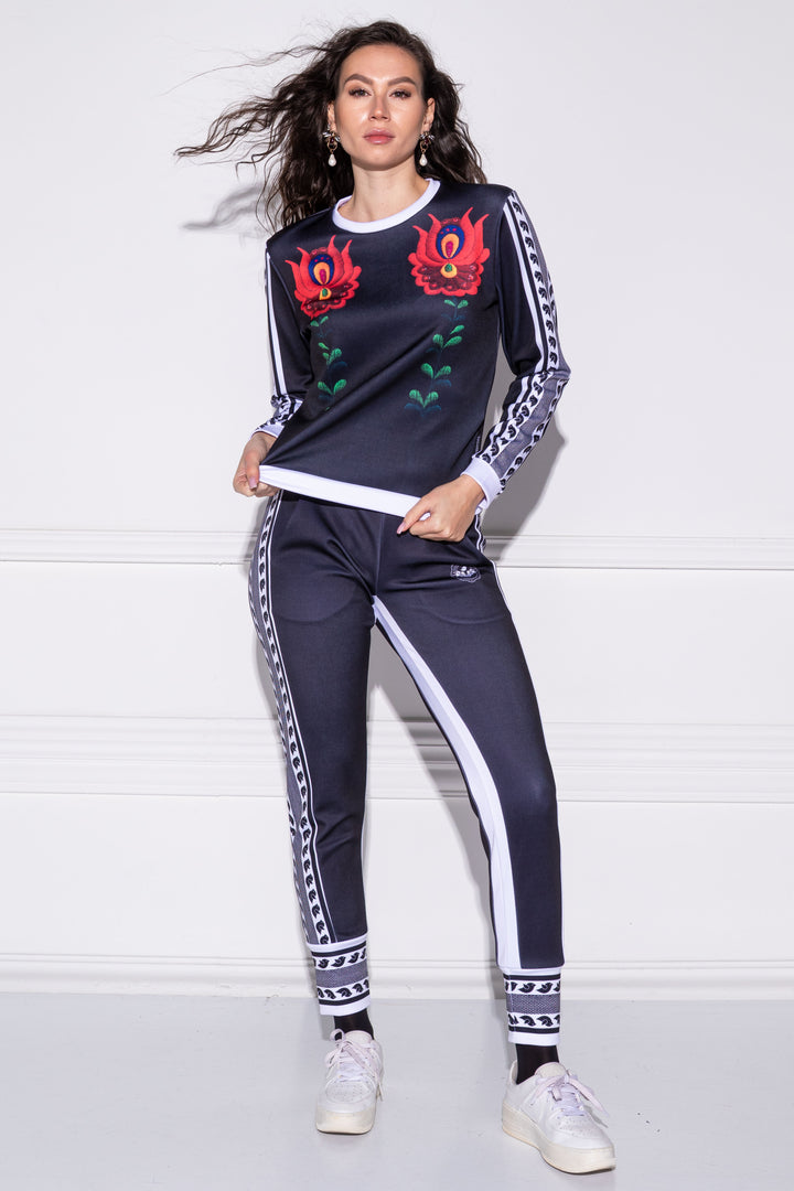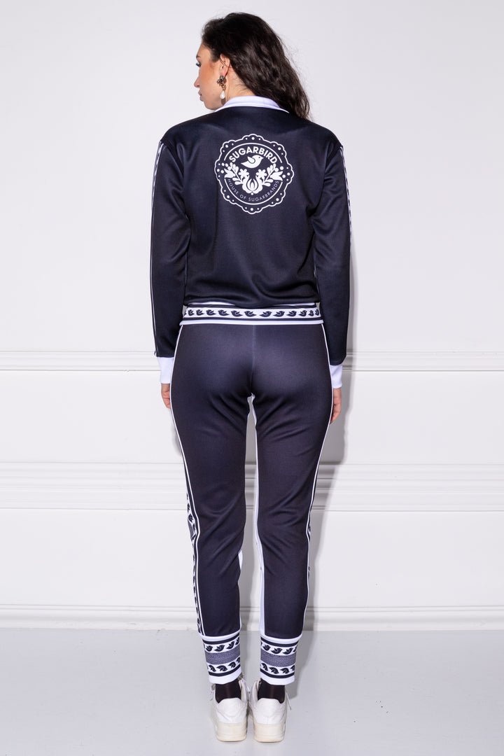 Hosszú, szűk szárú, derékon gumizott nadrág. Alját extra széles fekete pánt szegi. Elején felül svédzsebek, oldalán és a belső szárán külön szabott pántok díszítik. Hátára SUGARBIRD feliratú címkét varrtunk.