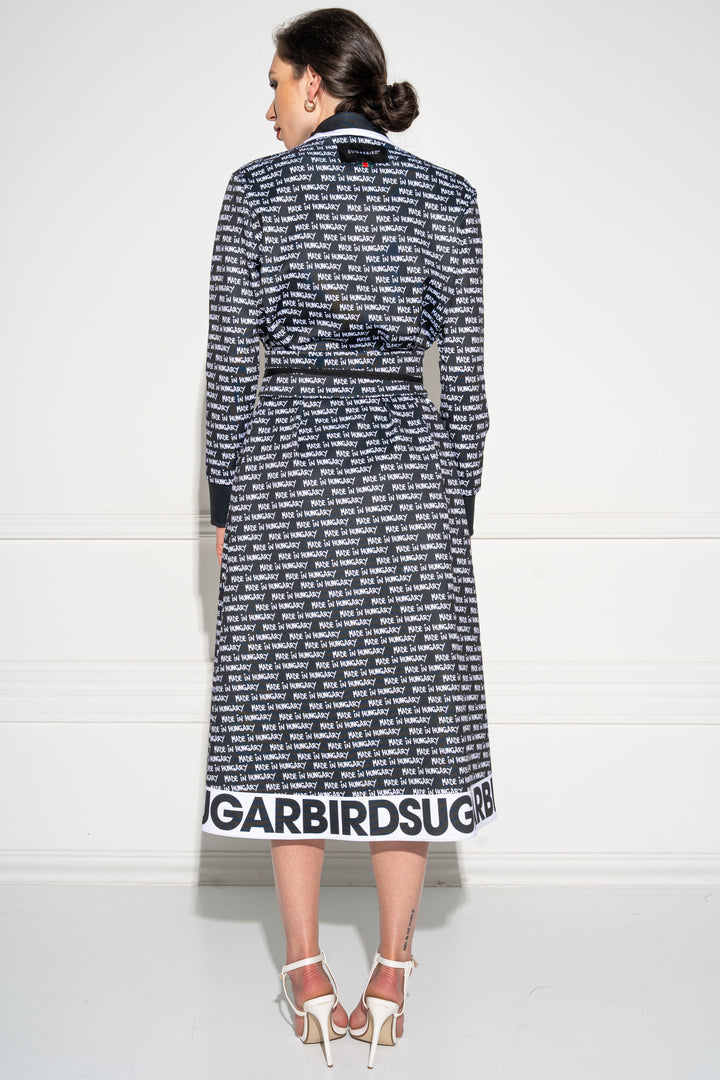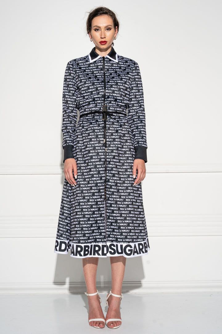 Hosszú ujjú, térd alá érő, laza fazonú ruha. Szoknya része bővülő „A” vonalú. Nyakát rászabott gallér, ujja alját pedig széles, félbehajtott pánt szegi. Elején középen zipzárral nyílik, oldalaiba zsebeket helyeztünk. Hátára szövött szalaggal ellátott SUGARBIRD feliratú címkével díszítettük. A ruhához egy külön álló gumis öv is készült, amely ezüst színű övcsattal záródik, végeihez rögzített hosszú kötő kedv szerint körbe vagy masnira fűzhető.