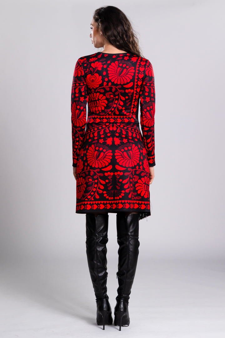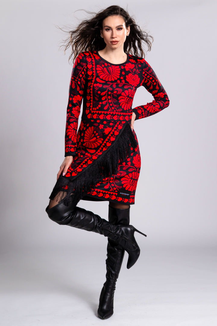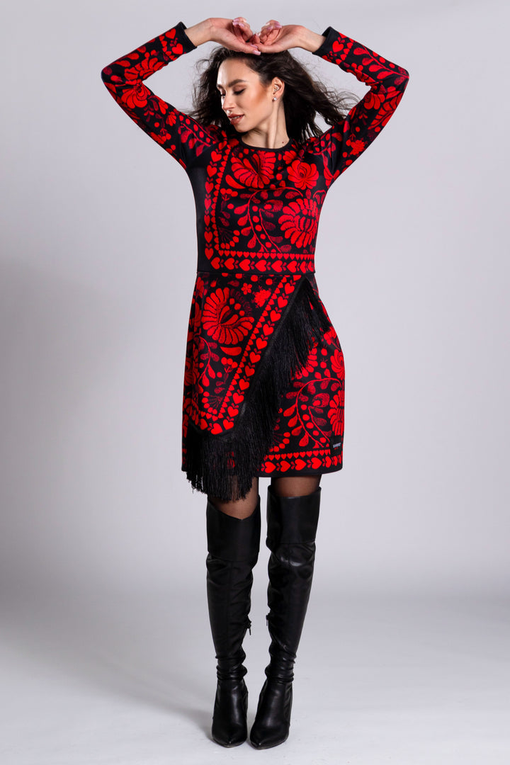 Hosszú ujjú, térd feletti hosszúságú, alak követő ruha. Kerek kivágású nyakát keskeny pánt szegi. Szoknya részén az átlapolás szélét széles, rojtos kellék díszíti.
