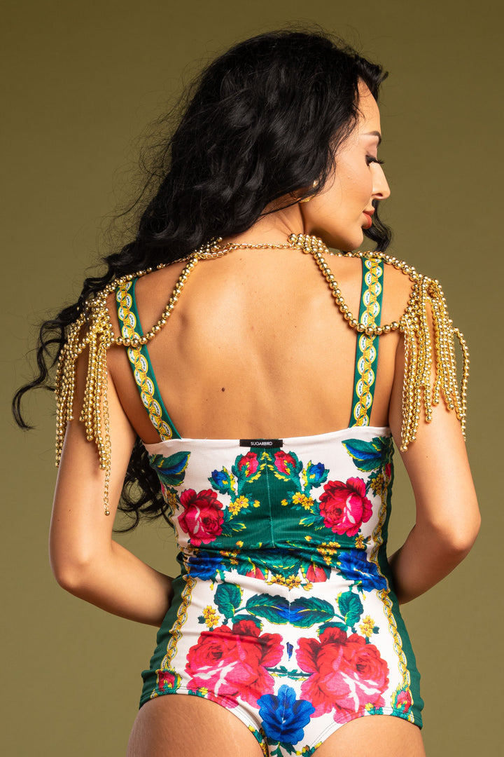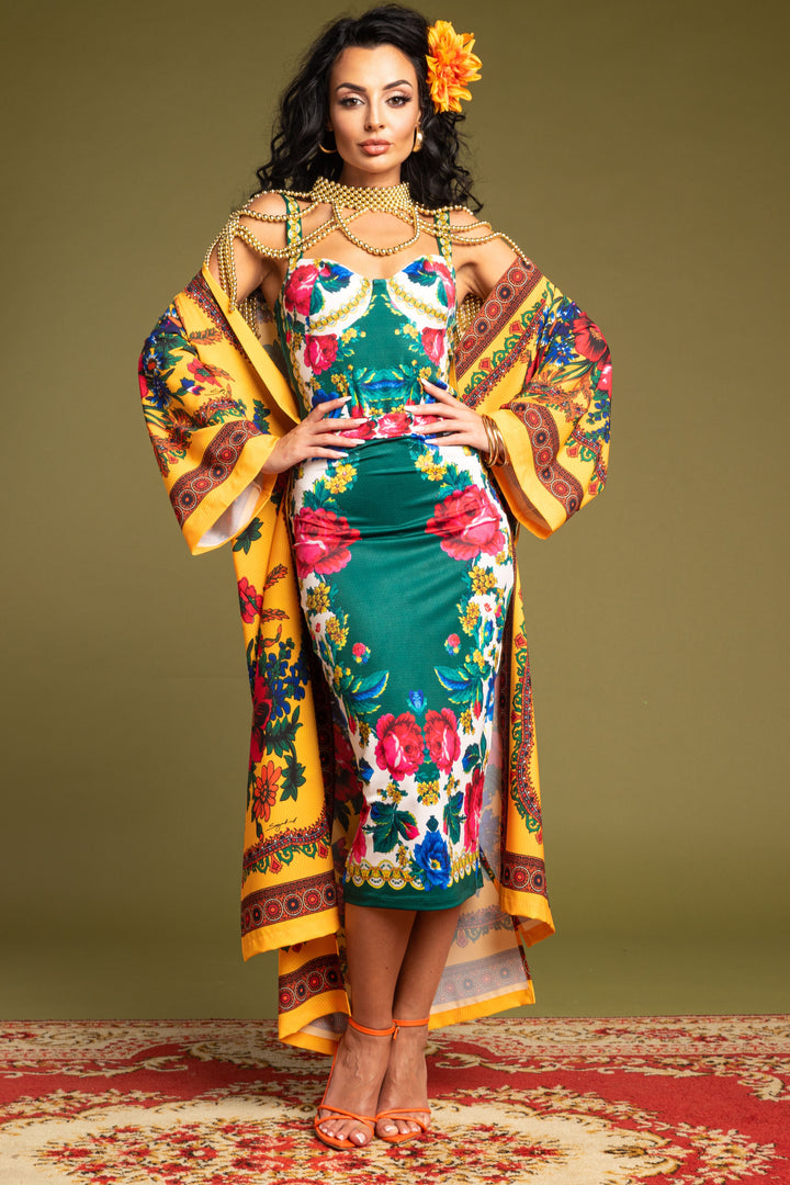 Háromnegyedes ujjú, alak követő, térd alatti hosszúságú ruha. Kerek nyakköre keskeny, félbe hajtott pánttal szegett. Derekát dupla és széles fodrok díszítik. Bal ujja aljára SUGARBIRD feliratú címkét varrtunk.