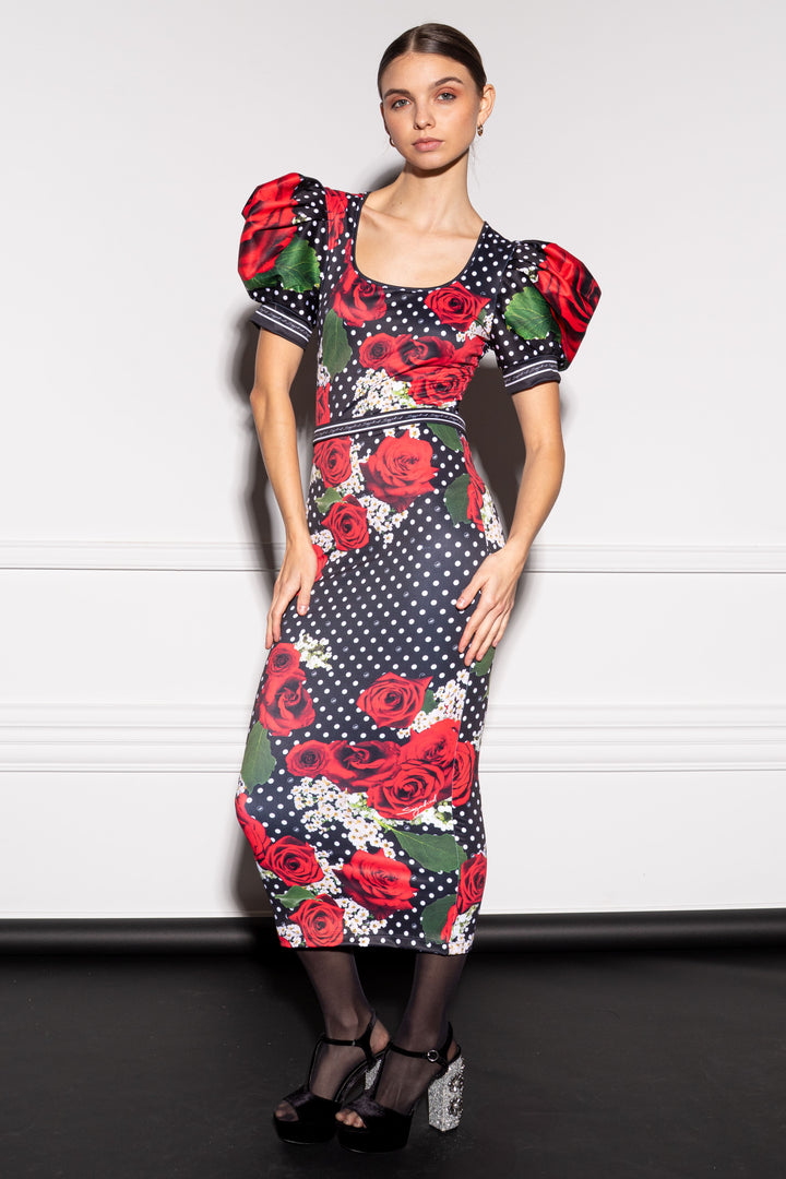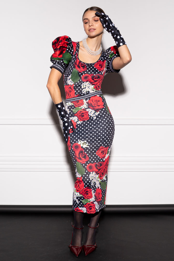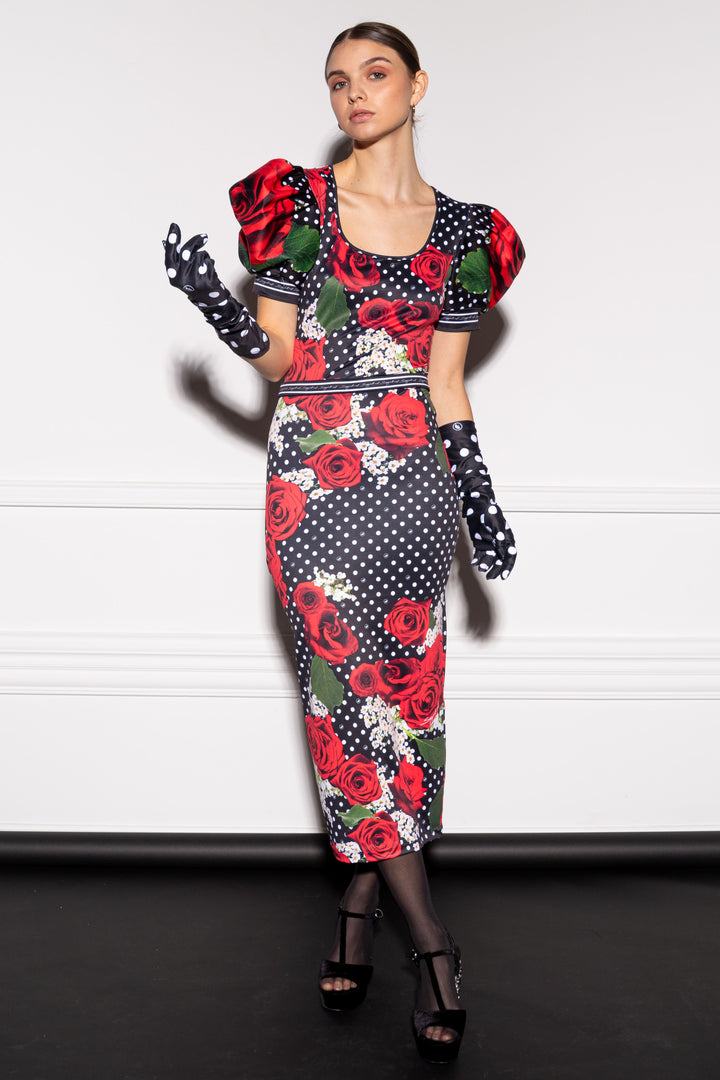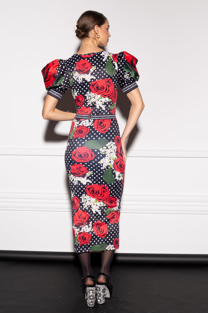 Rövid és puffos ujjú, vádliközép hosszúságú, alak követő ruha. Nyaka mélyen dekoltált, melyet keskeny pánt szeg el. Hátára SUGARBIRD feliratú címkét varrtunk. A ruhához egy különálló gumis öv is készült, amely fém övcsattal záródik.
