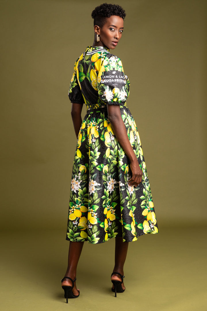 Vádliközép hosszúságú, háromnegyedes és puffos ujjú ruha. Nyakát szabott gallér szegi, háta közepén zipzárral nyitható. Derékon szűkített, szoknya része dúsan húzott és lefelé bővülő. Hosszú kötője derékra fűzhető. Elejére SUGARBIRD feliratú címkét varrtunk.