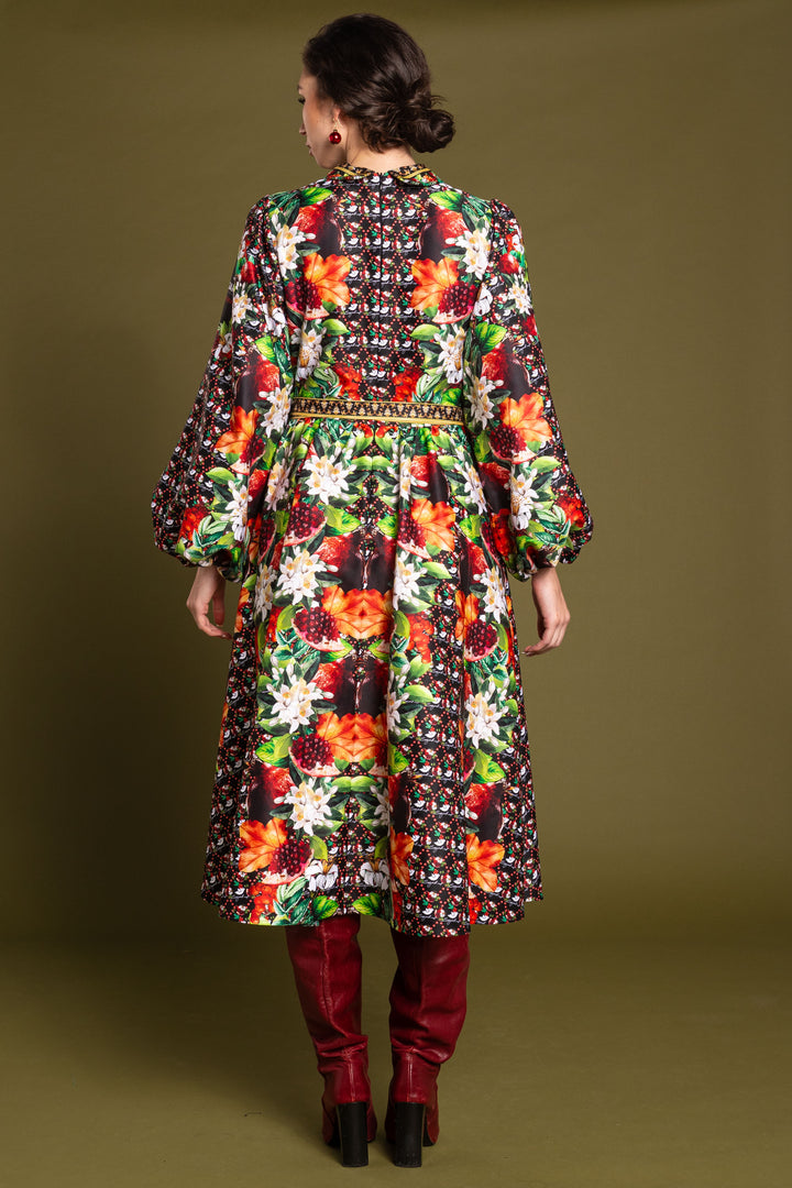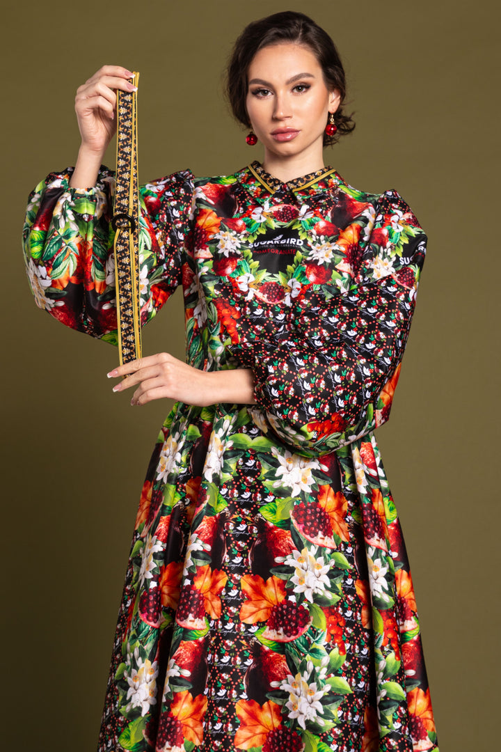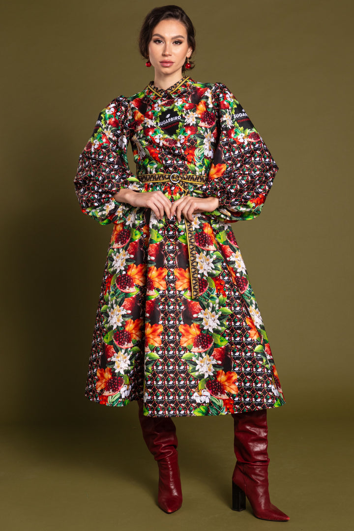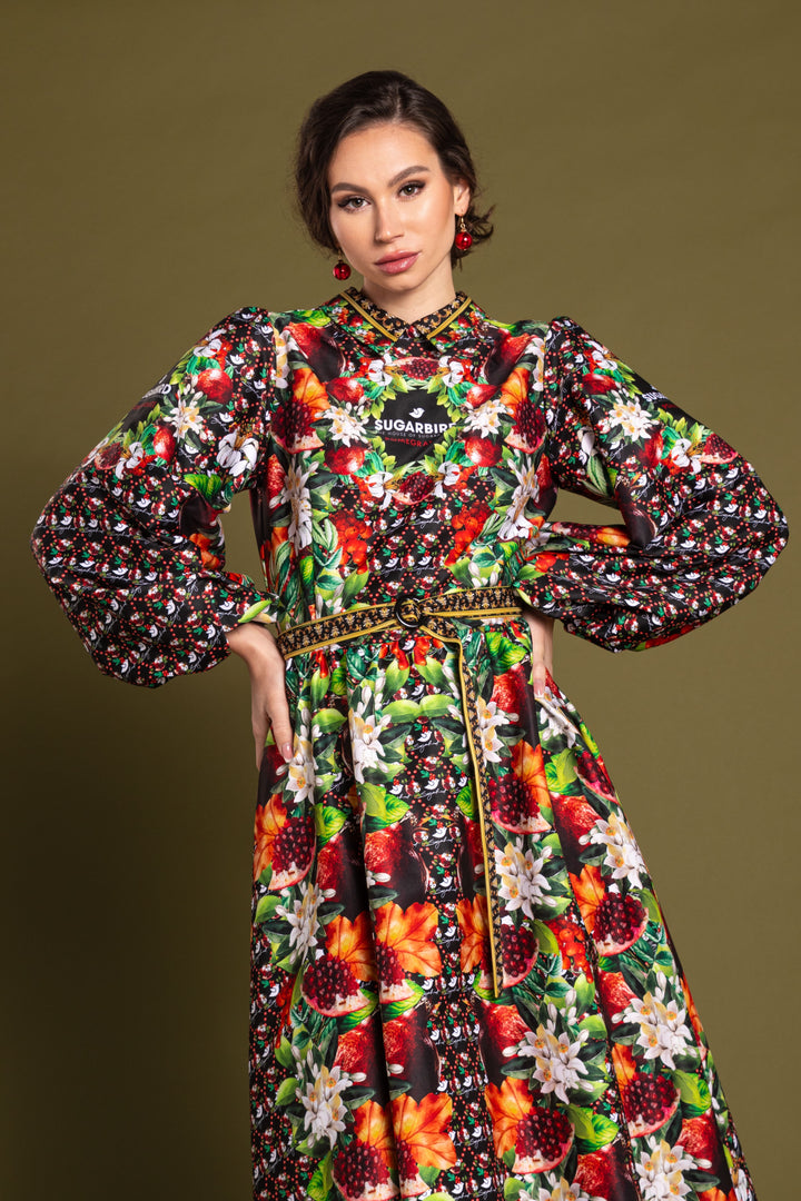 Vádliközép hosszúságú, háromnegyedes és puffos ujjú ruha. Nyakát szabott gallér szegi, háta közepén zipzárral nyitható. Derékon szűkített, szoknya része dúsan húzott és lefelé bővülő. Hosszú kötője derékra fűzhető. Elejére SUGARBIRD feliratú címkét varrtunk.