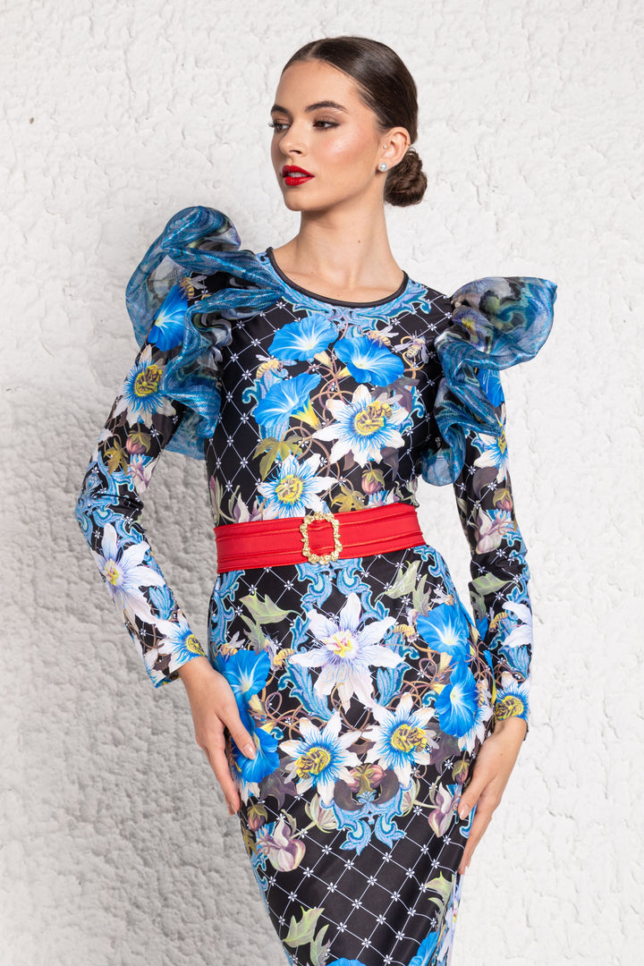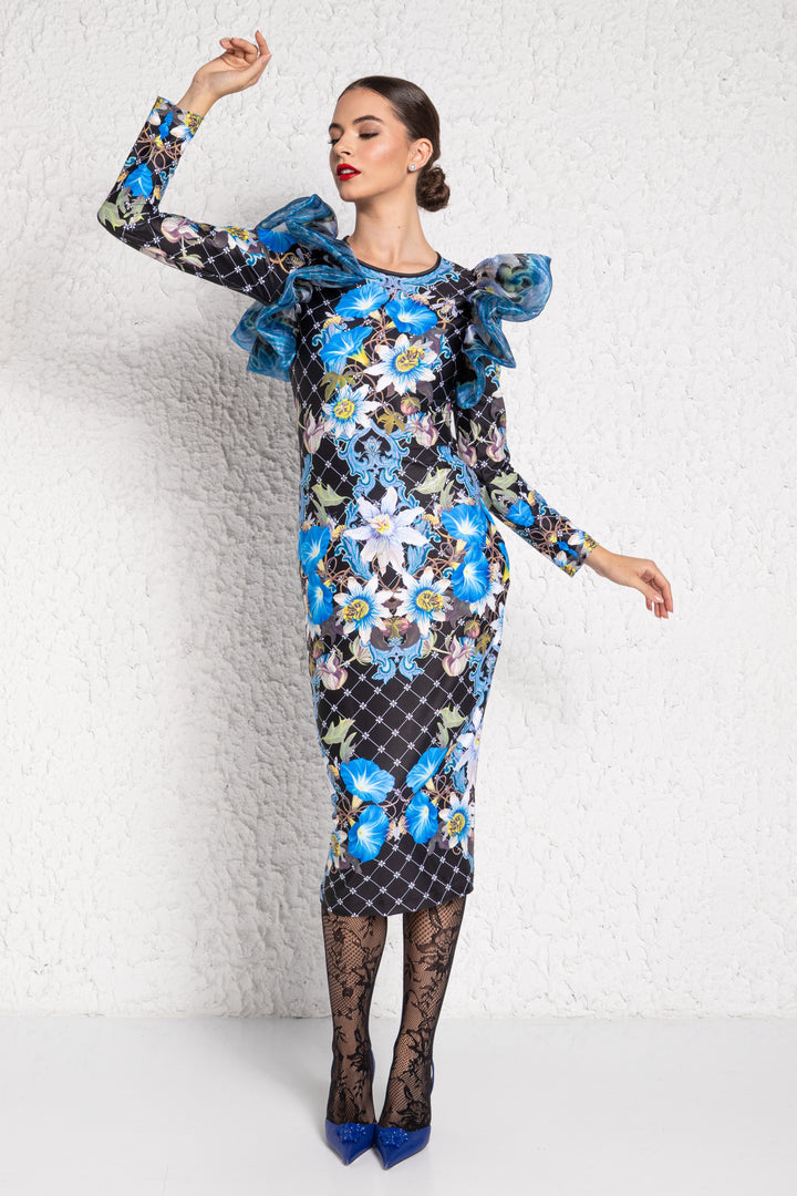 Hosszú ujjú, vádliközép hosszúságú, alak követő ruha. Zárt kerek nyakkivágása keskeny pánttal szegett. Vállain széles és húzott fodor, hátán SUGARBIRD feliratú címke és masnis kellék díszíti.