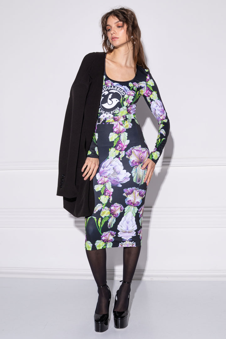 Vádliközép hosszúságú, hosszú ujjú, alak követő ruha. Nyaka ívesen dekoltált, mely keskeny pánttal szegett. Derekán övpánt díszíti. A fazonra SUGARBIRD feliratú címkét varrtunk.