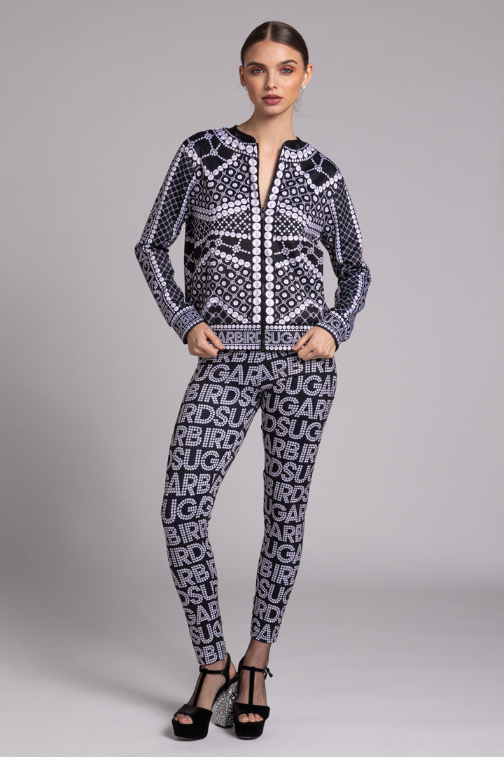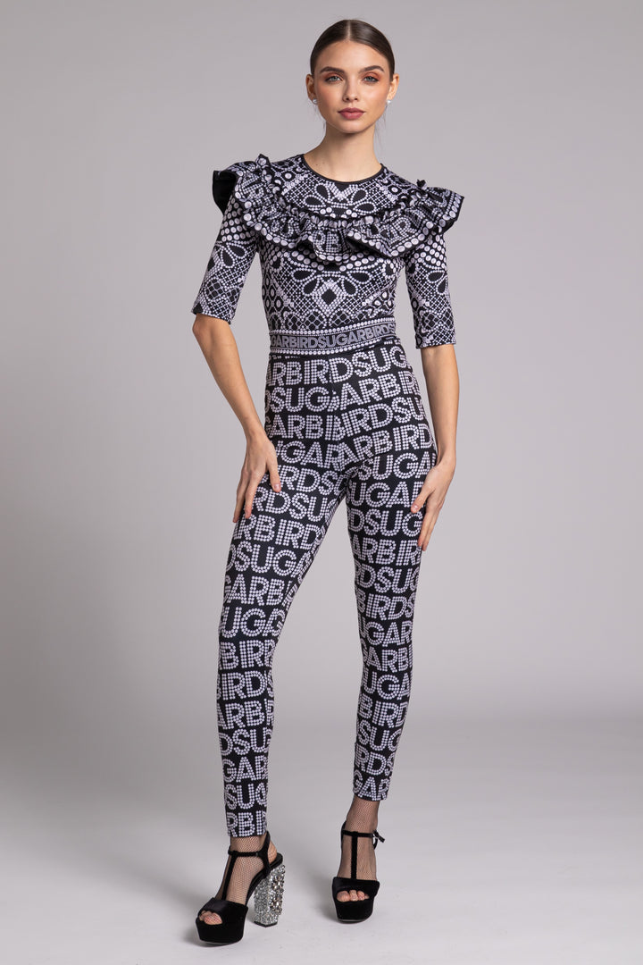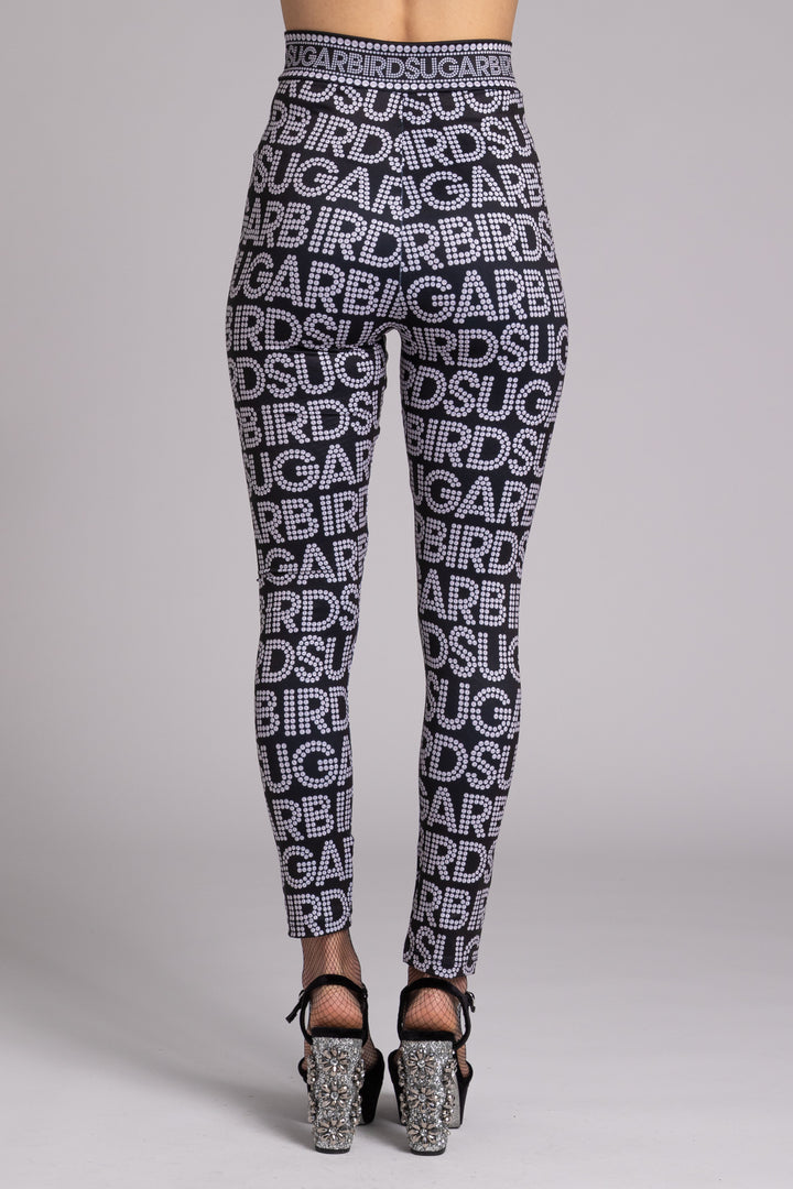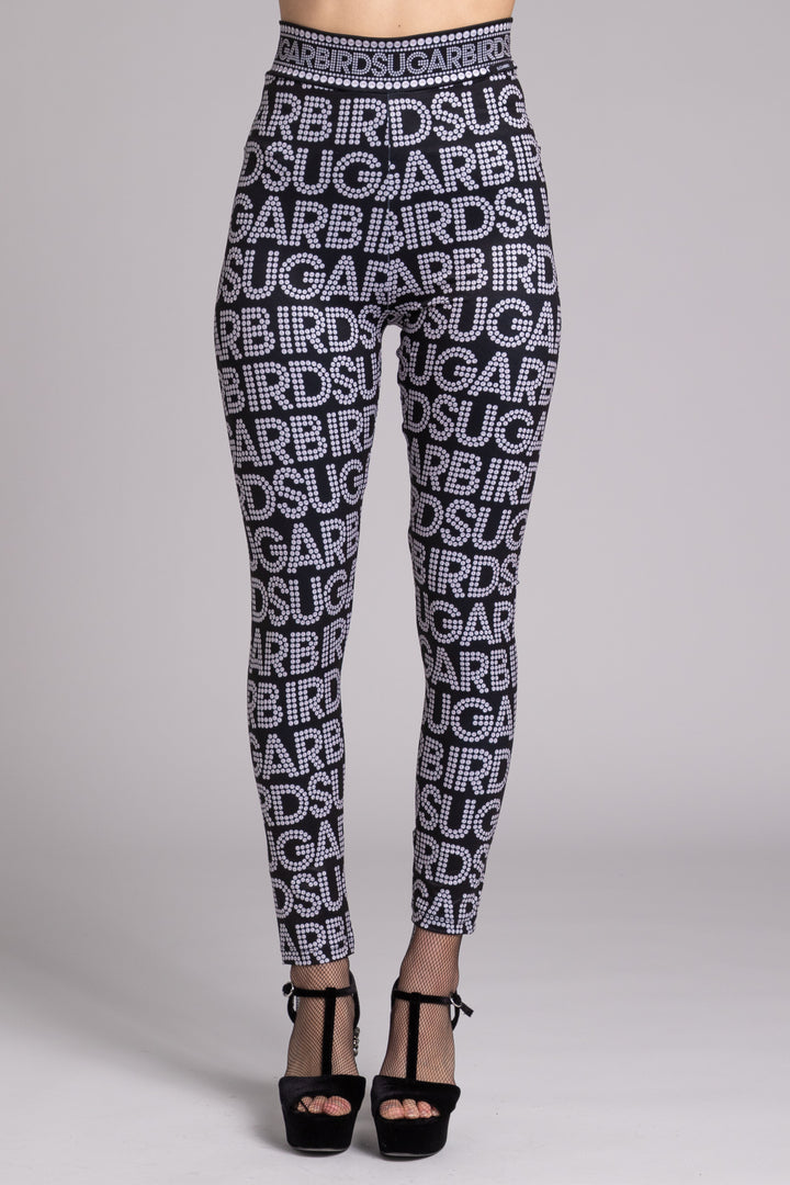 Szűk szárú, magas derekú alakkövető hosszú nadrág. Derekán félbehajtott pánt szegi. Elején SUGARBIRD feliratú címkével díszítettük.