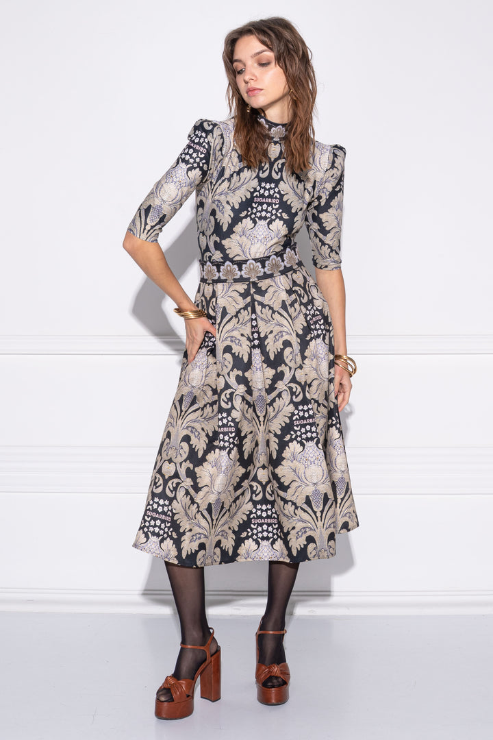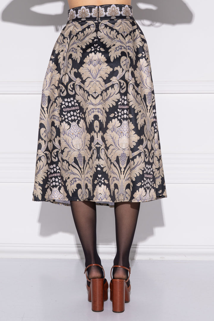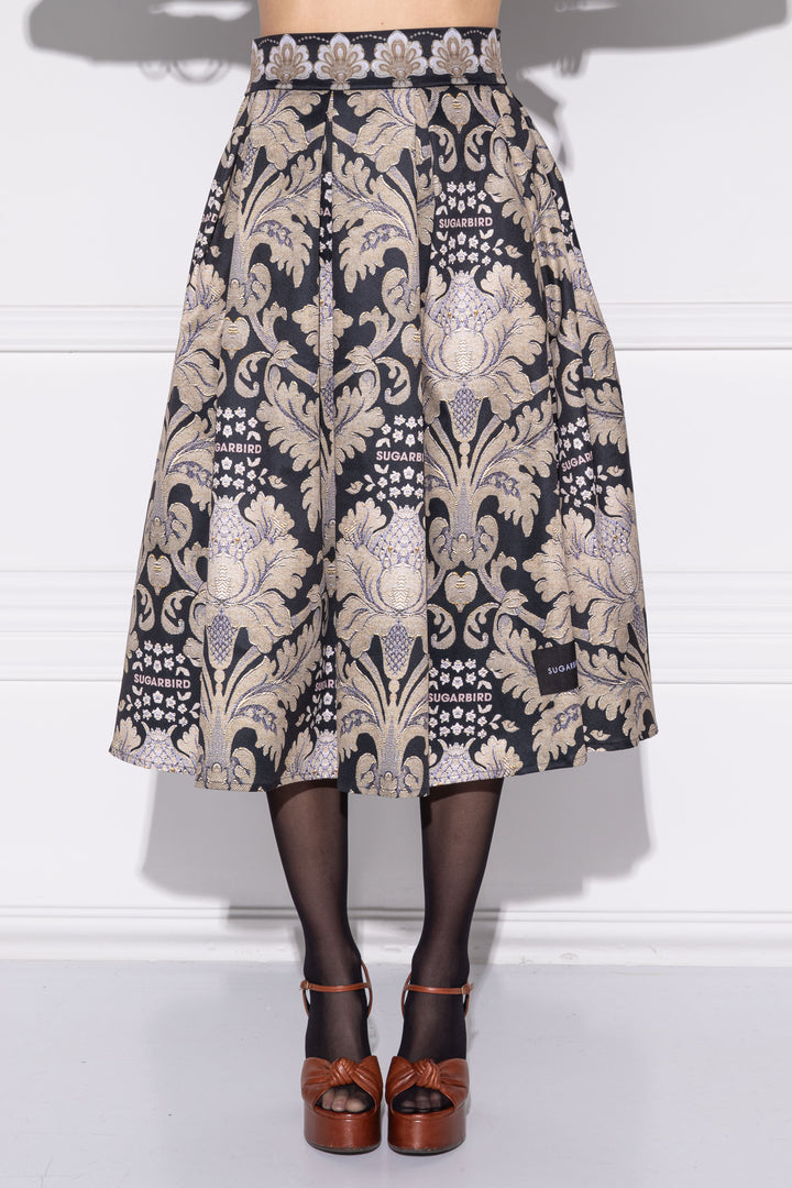 Térd alatti hosszúságú, „A” vonalú szoknya. Derekát az elején és a hátán is hajtások formázzák. A háta közepén zipzárral nyílik. A fazont SUGARBIRD feliratú címke díszíti.