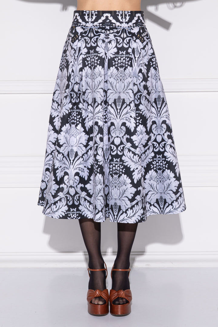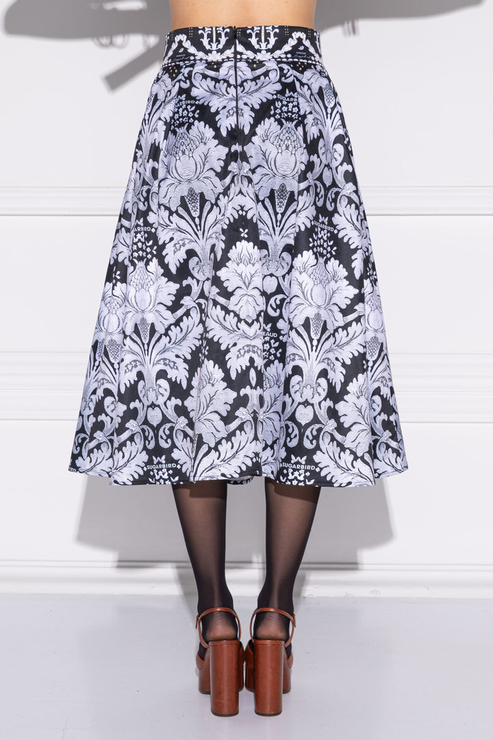 Térd alatti hosszúságú, „A” vonalú szoknya. Derekát az elején és a hátán is hajtások formázzák. A háta közepén zipzárral nyílik. A fazont SUGARBIRD feliratú címke díszíti.