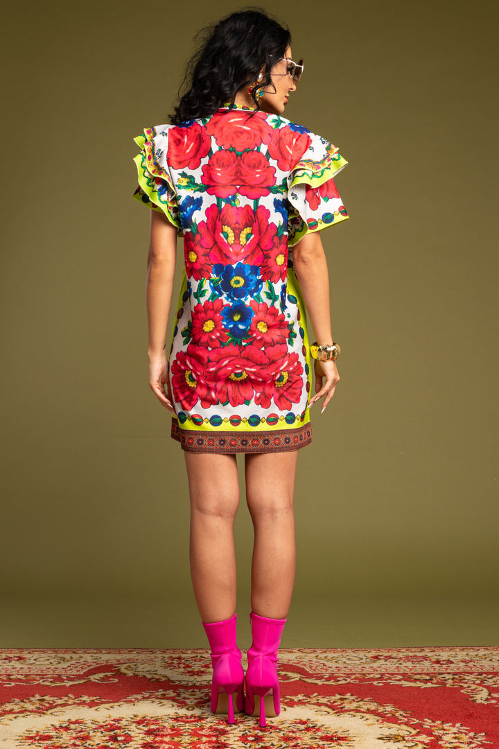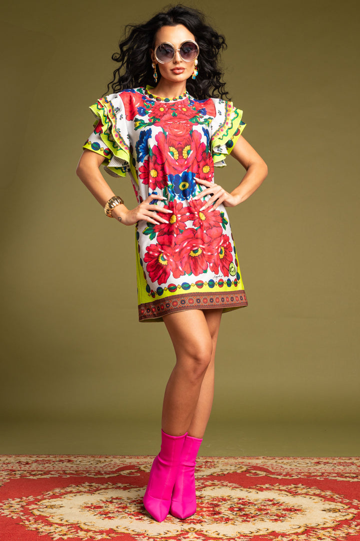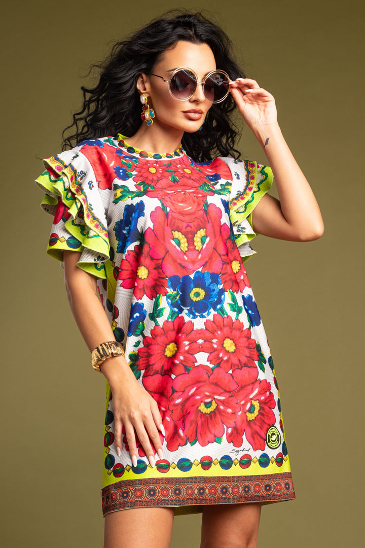 Térd feletti hosszúságú, rövid ujjú, bő fazonú ruha. Zárt és kerek nyakkivágása félbehajtott pánttal szegett. Vállait két-két széles és húzott fodor díszíti. Elejére SUGARBIRD BUDAPEST feliratú, madaras hímzett felvarrót helyeztünk.