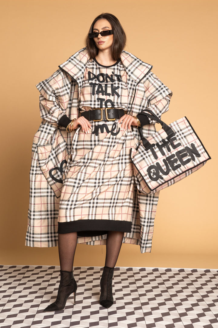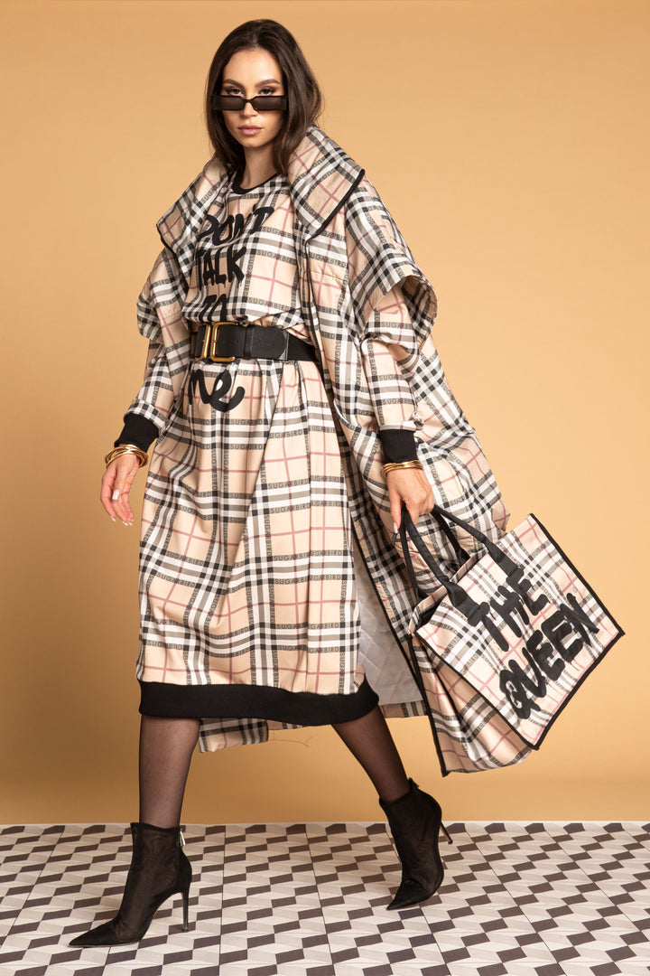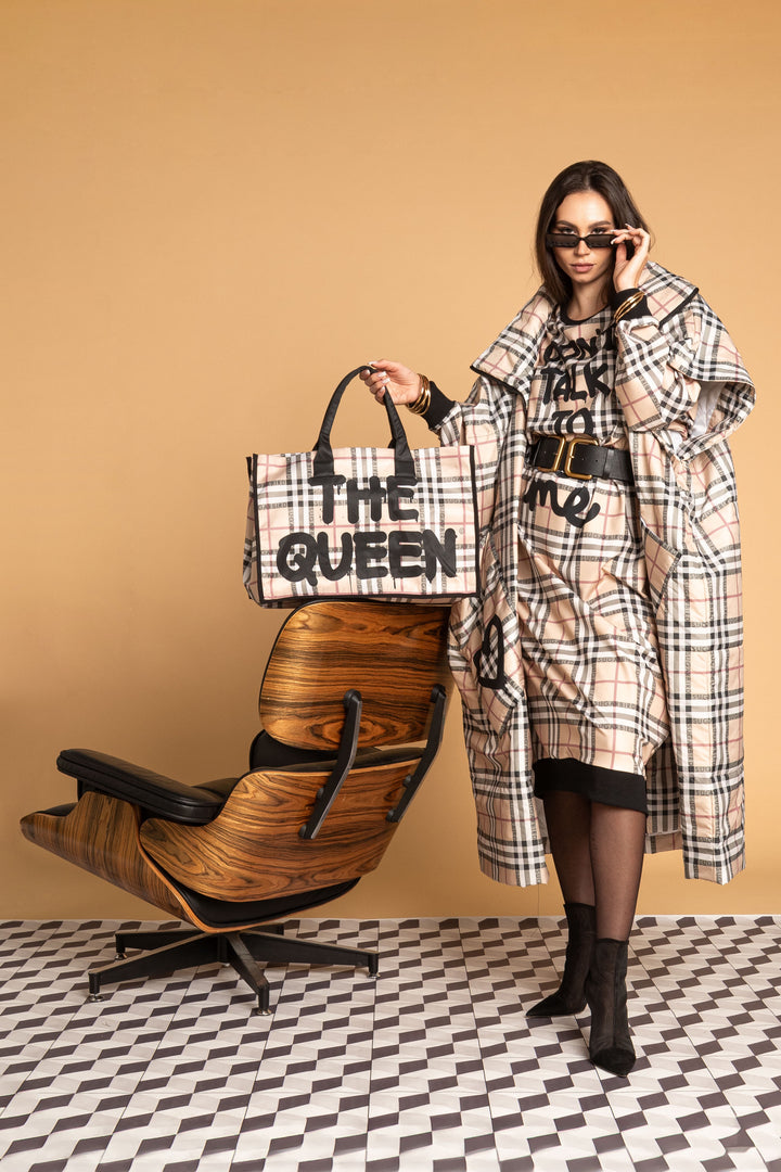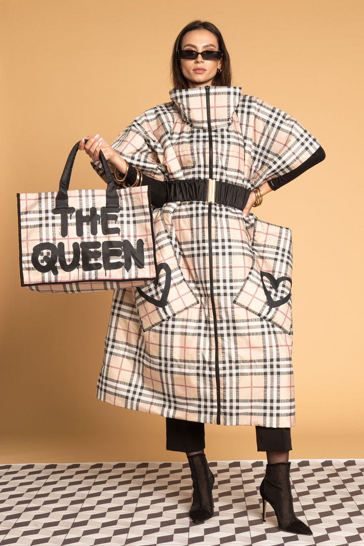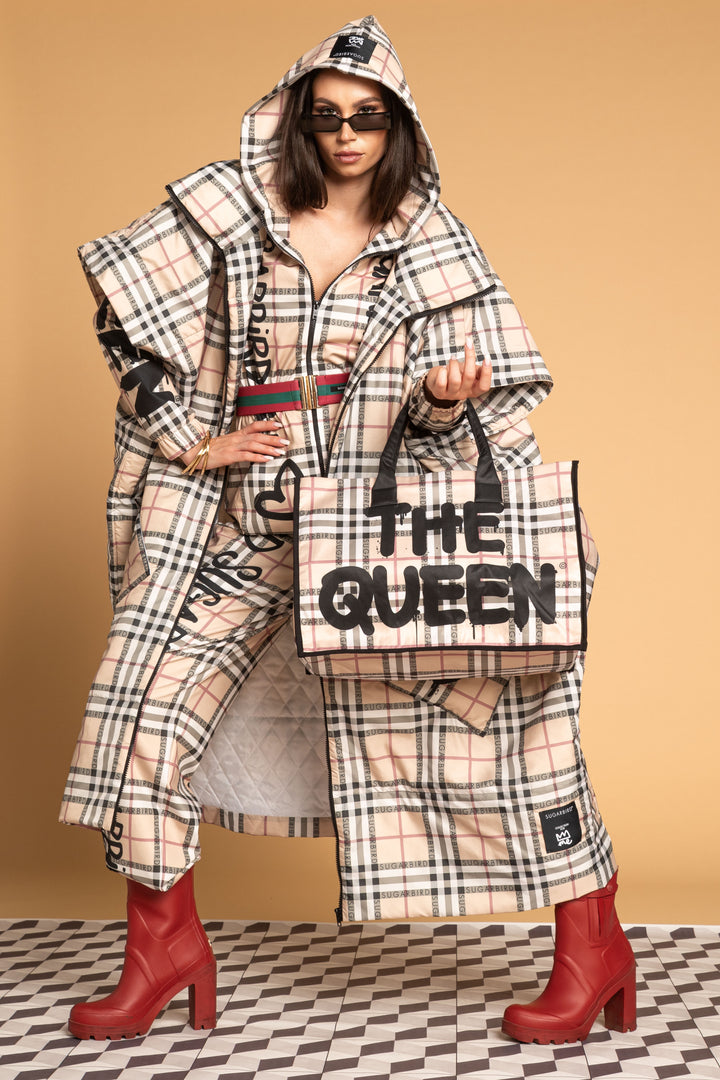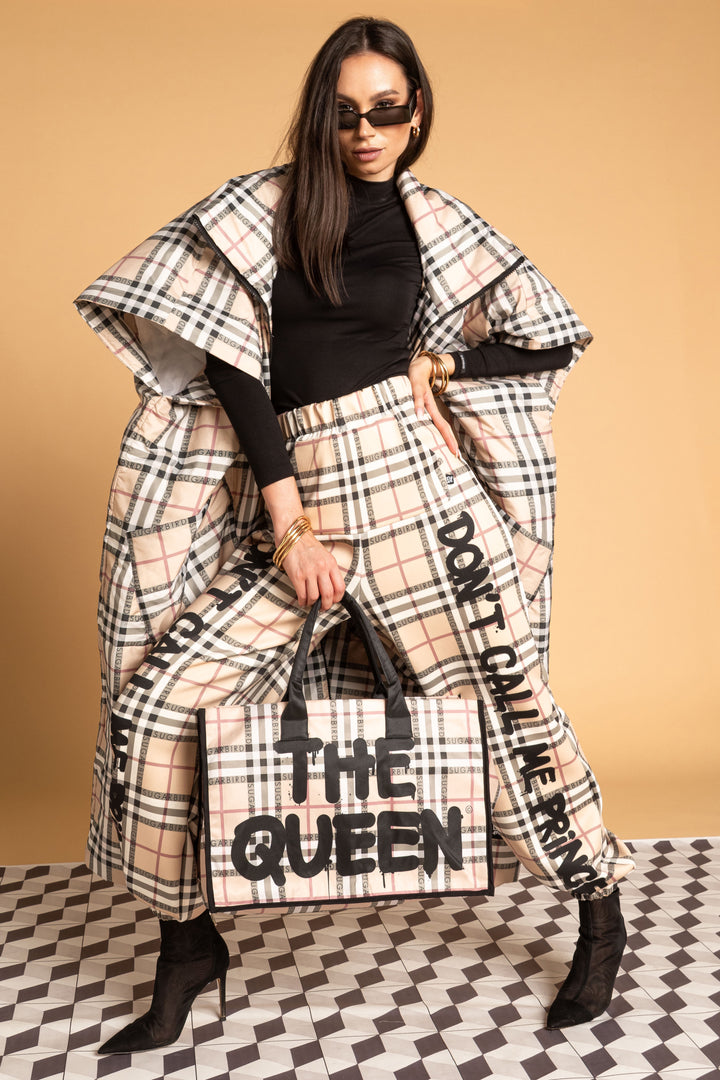 Fedezd fel az új LONDON QUEEN kollekciónk darabjait, melyet a bézs kockás minta időtlen eleganciája és az ikonikus QUEEN és SUGARBIRD feliratok kombinációja jellemez.