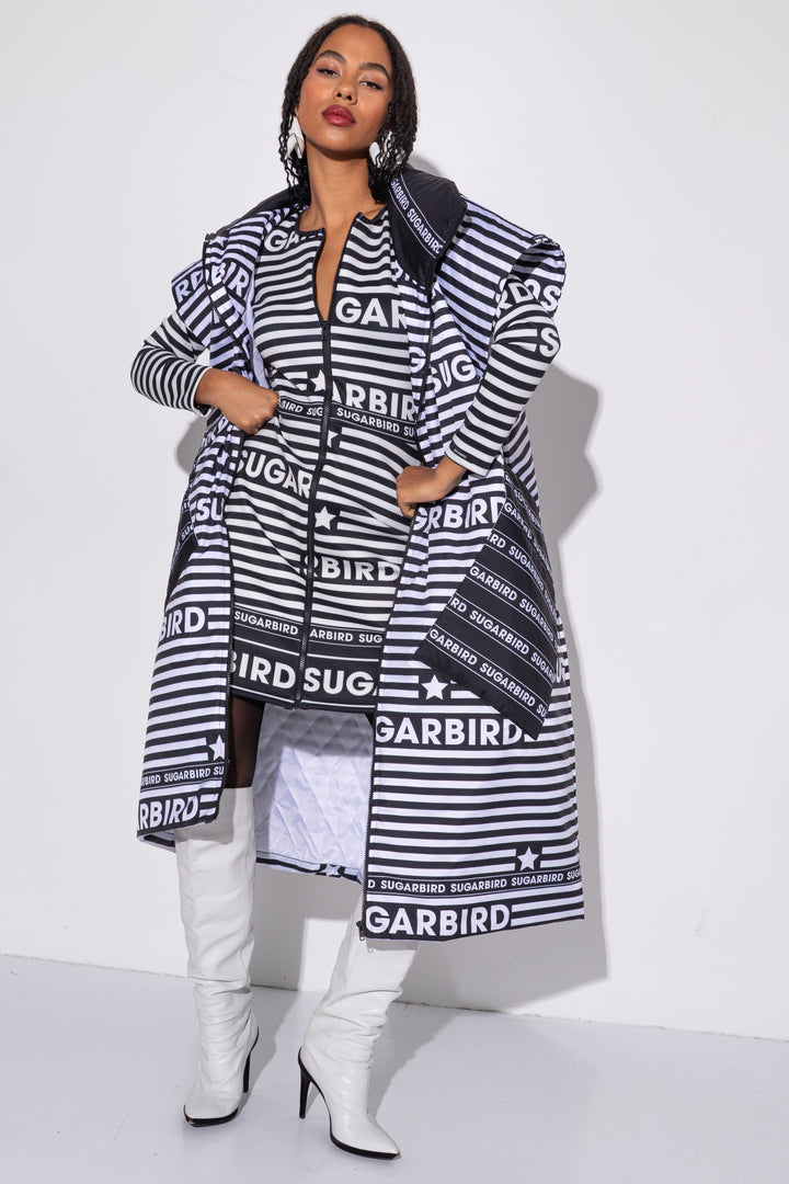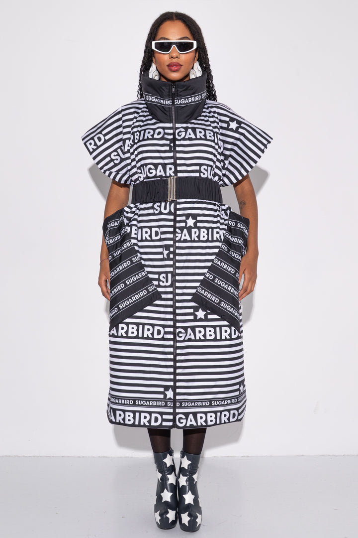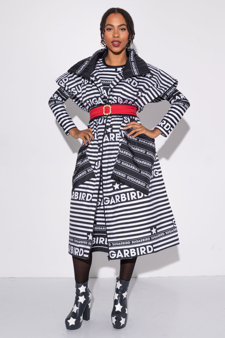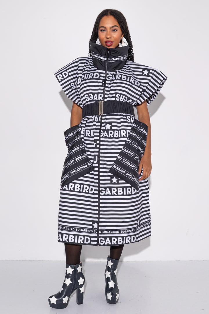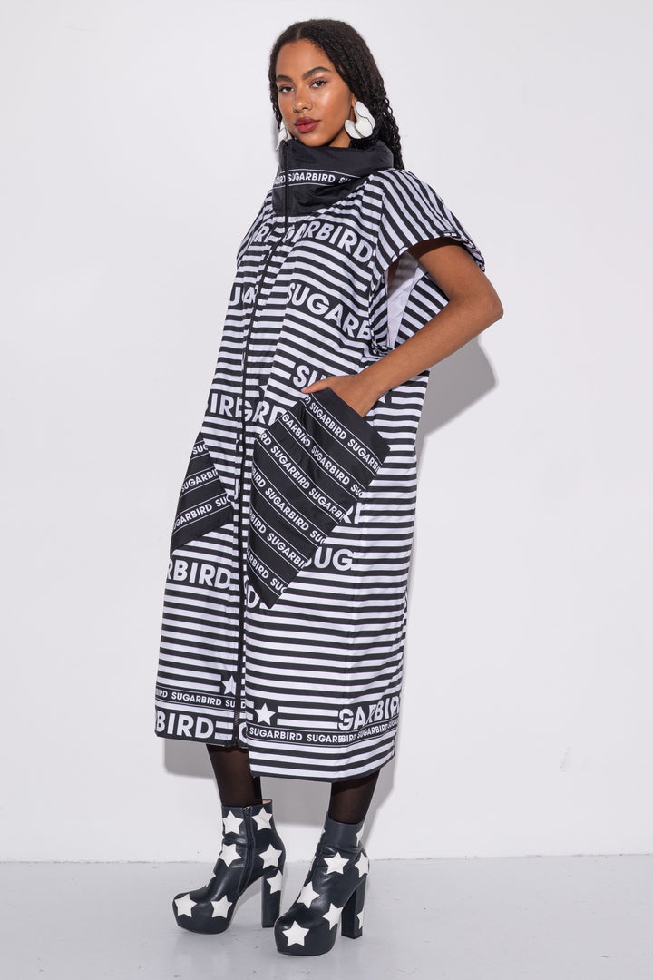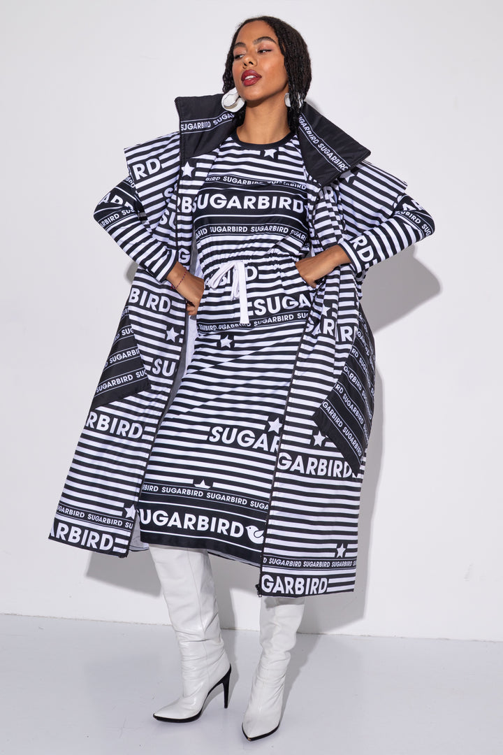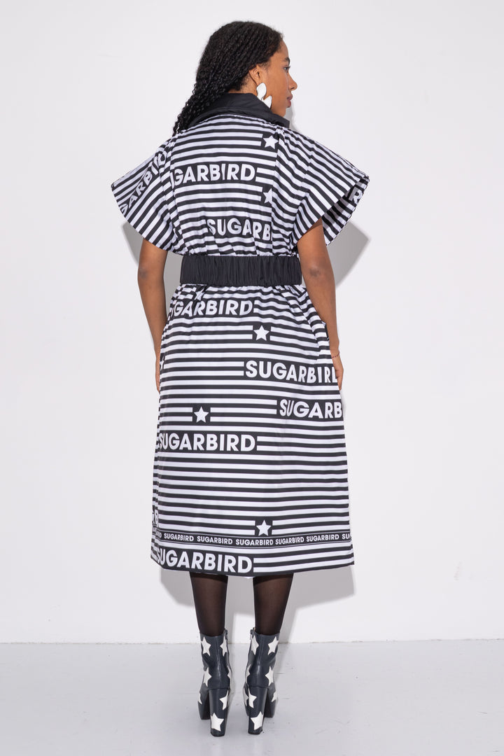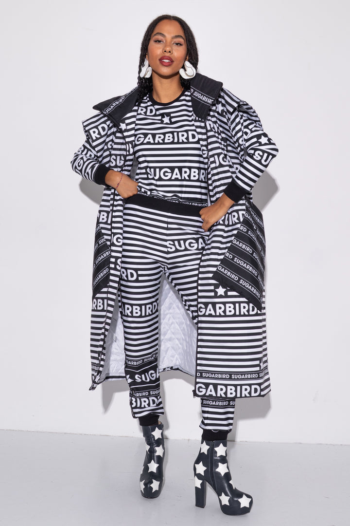 Kollekción darabjait fekete és fehér csíkos alapon SUGARBIRD feliratok printelt mintája díszíti.