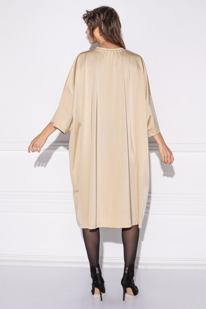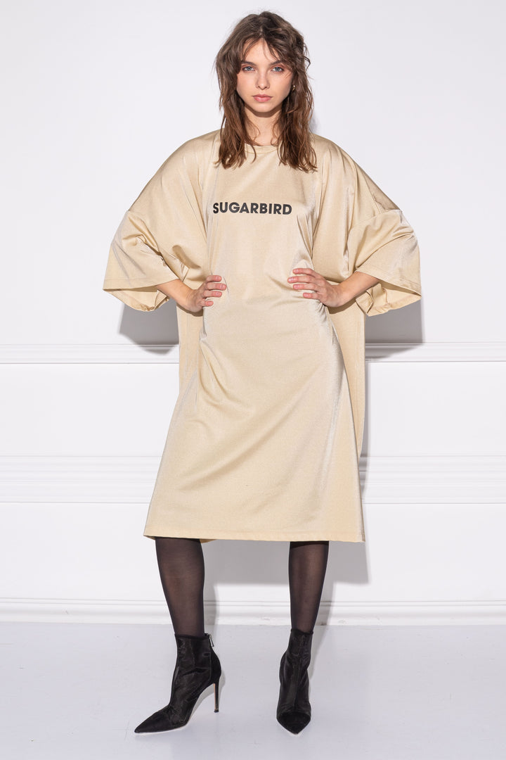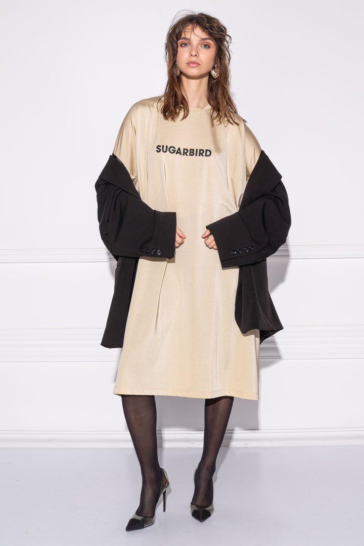 Rövid ujjú, bő, egyenes fazonú, combközépig érő tunika. Nyaka zárt és kerek, mely keskeny félbe hajtott pánttal szegett. Kedvenc és kényelmes alapdarab, melyet SUGARBIRD feliratú printtel díszítettünk.