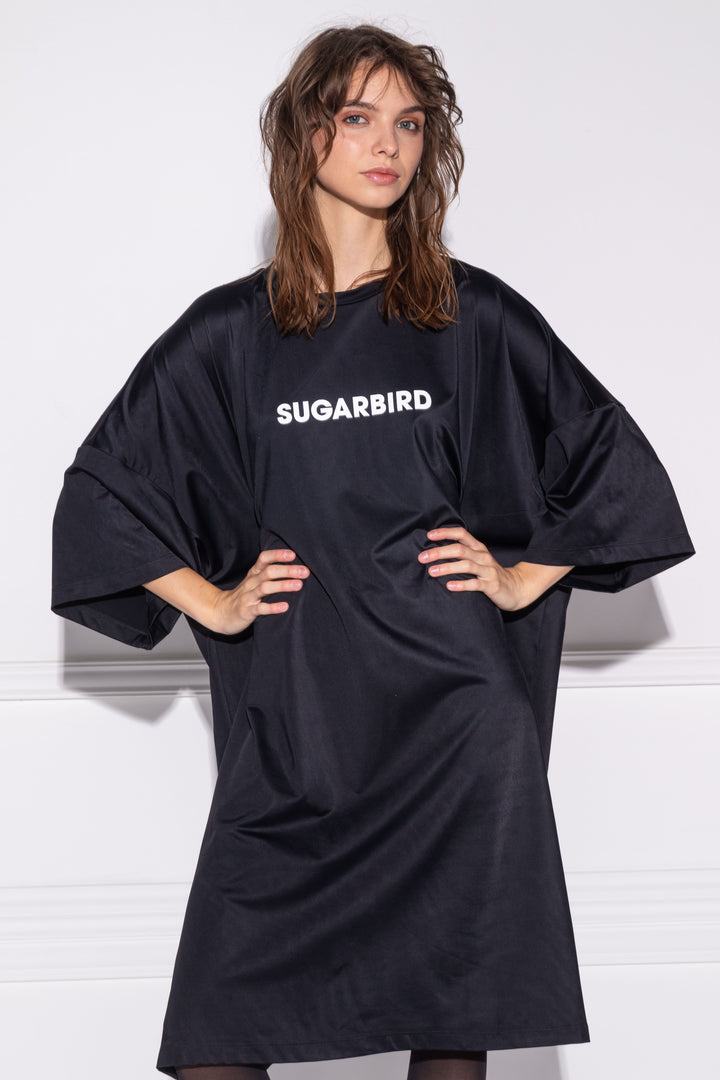 Rövid ujjú, bő, egyenes fazonú, combközépig érő tunika. Nyaka zárt és kerek, mely keskeny félbe hajtott pánttal szegett. Kedvenc és kényelmes alapdarab, melyet SUGARBIRD feliratú printtel díszítettünk.