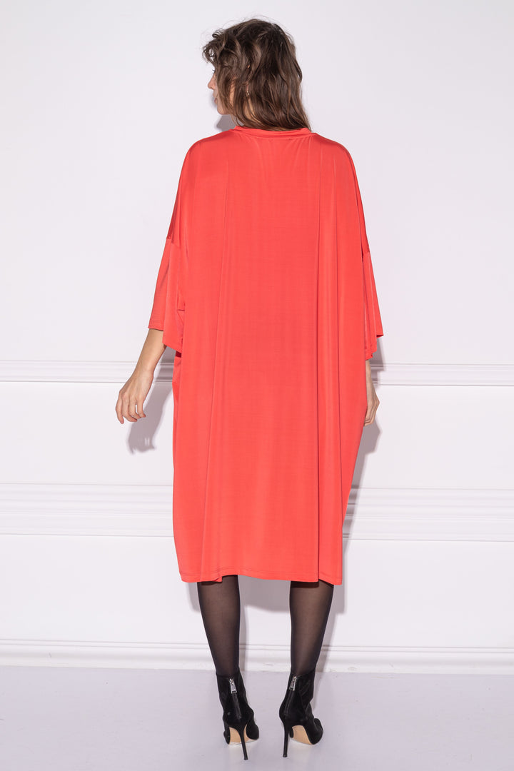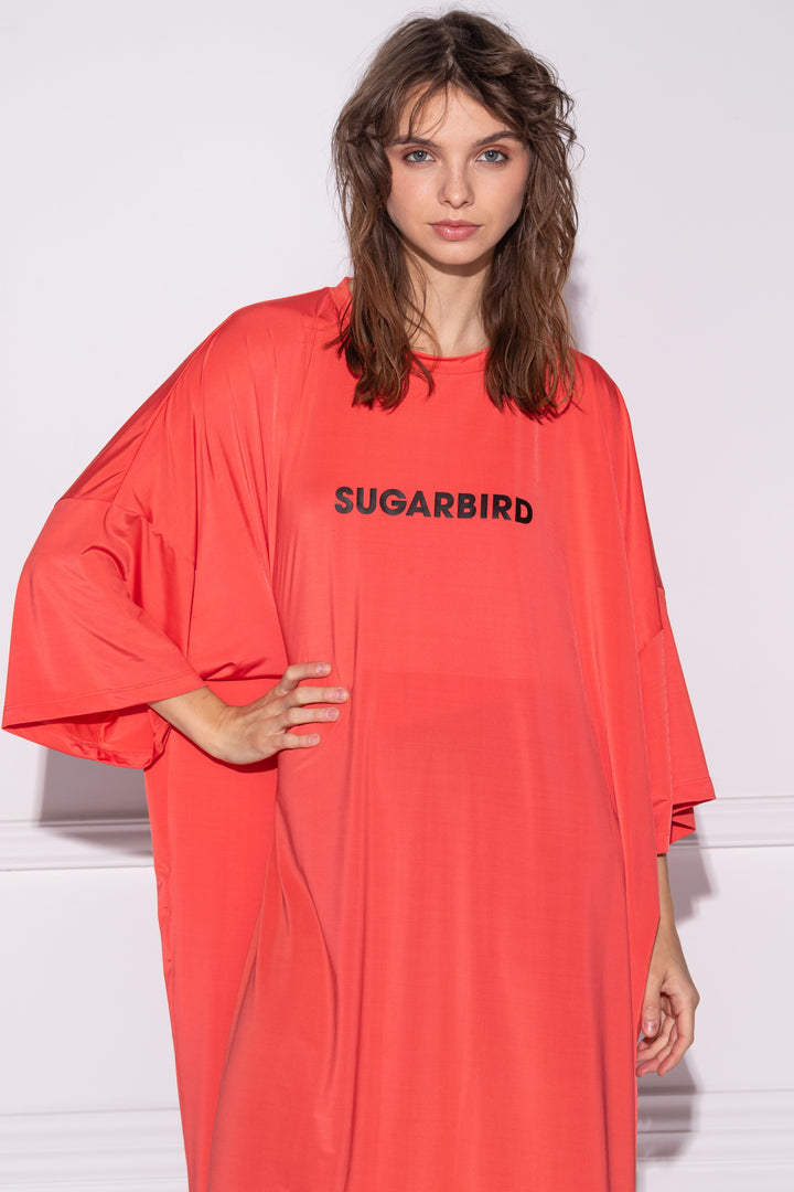 Rövid ujjú, bő, egyenes fazonú, combközépig érő tunika. Nyaka zárt és kerek, mely keskeny félbe hajtott pánttal szegett. Kedvenc és kényelmes alapdarab, melyet SUGARBIRD feliratú printtel díszítettünk.