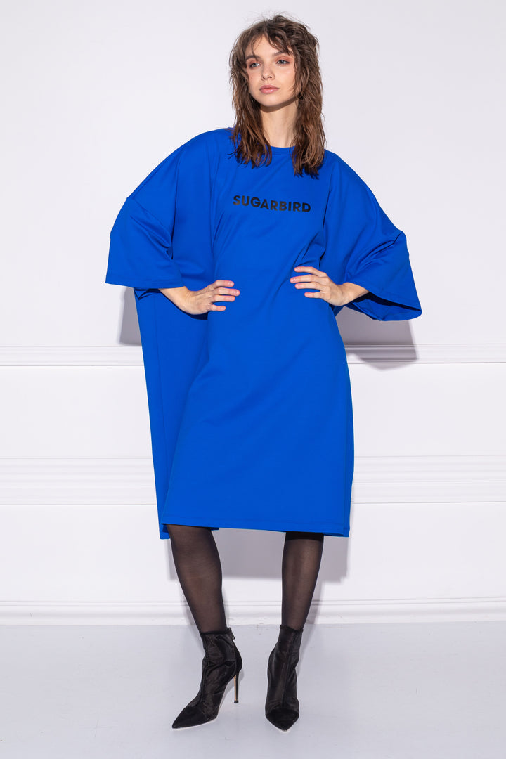 Rövid ujjú, bő, egyenes fazonú, combközépig érő tunika. Nyaka zárt és kerek, mely keskeny félbe hajtott pánttal szegett. Kedvenc és kényelmes alapdarab, melyet SUGARBIRD feliratú printtel díszítettünk.