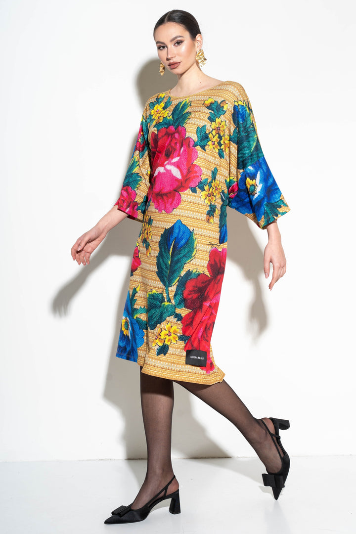 Rövid ujjú, térdig érő, extra laza és bő fazonú tunika. Zárt kerek nyaka keskeny pánttal szegett. Hosszú, végzárókkal ellátott kötőjével derékra szűkíthető. Hátán a nyakánál elhelyezett pánt állítható. A fazont SUGARBIRD feliratú címkével díszítettük.