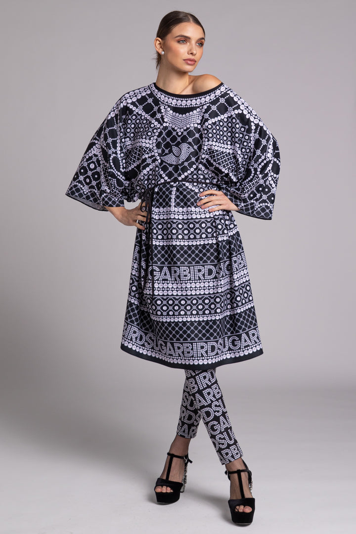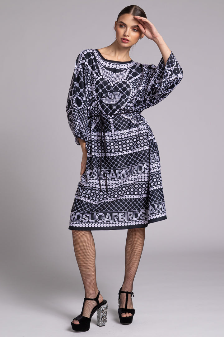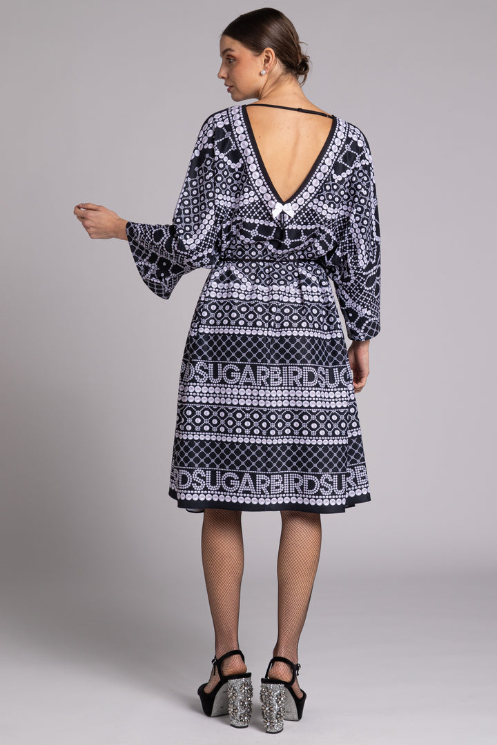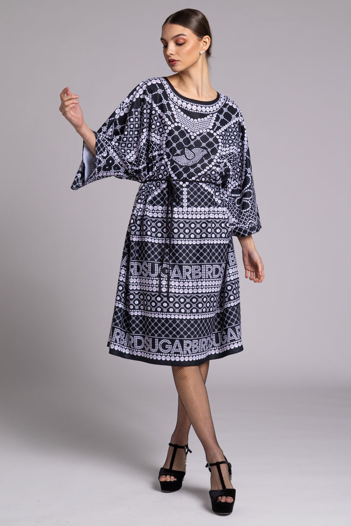 Rövid ujjú, térdig érő, extra laza és bő fazonú tunika. Elől zárt, hátul „V” formában kivágott nyaka keskeny pánttal szegett. Hátára a kivágás felett egy állítható pántot rögzítettünk. Hosszú és keskeny kötőjével derékra szűkíthető a fazon. Hátán fehér masnis kellék és SUGARBIRD feliratú címke díszíti.